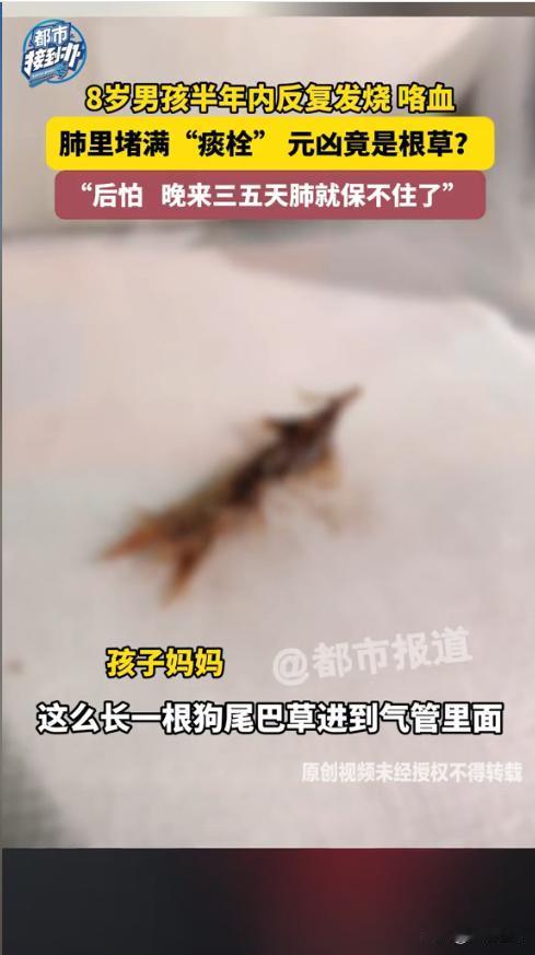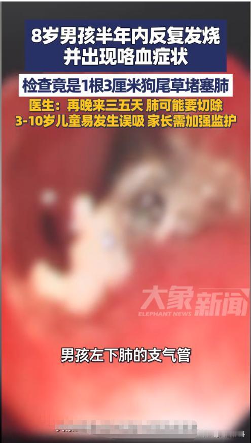 “悲剧还是发生了!”1月31日,河南新乡,一8岁的男孩,半年内反复发烧、咳嗽,甚至出现咯血症状,就医检查才后发现,他的肺里竟卡着一根3厘米长的狗尾草,医生称再晚来三五天,肺可能就要切除。网友:草怎么进到肺里的? 儿童玩耍时,其实最怕的就是手里拿着东西跑,稍有不小心就会磕着碰着,一般家长都会阻止,尤其是尖锐的东西,但是谁能想到一棵草竟也会带来这么大的危害! 半年前的一天,男孩和小朋友在户外玩耍,手里拿着一根狗尾草到处跑,结果跌倒时一个大喘气不小心将草吸入了肺里,由于男孩当时没有出现任何症状。所以家长也不知道这件事。 没过多久,男孩就开始反复发烧、咳嗽,家人以为是普通感冒或肺炎,辗转多家医院治疗都没有好转,直到最近男孩甚至开始咯血,做了详细的肺部检查,才发现病因。 检查时,医生发现男孩的支气管竟被一根狗尾草堵住,内部已经积满了脓液,如果再晚来三五天的话,可能会造成肺化脓,肺就要切除。 医生提醒,3-10岁的儿童容易发生误吸事件,因此家长要加强监护,避免孩子在玩耍时将异物吸入气道。如果孩子出现反复咳嗽、发烧且治疗无效的情况,一定要警惕气道异物的可能。 信息来源:《1月31日(报道)河南新乡,8岁男孩半年内反复发烧,并出现咯血症状,检查竟是1根3厘米狗尾草堵塞肺河南dou知道
