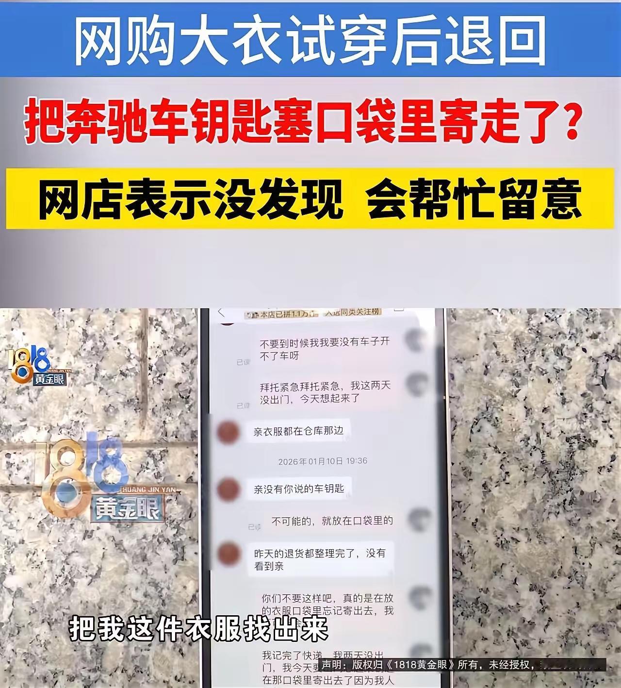 嘉兴有位女士最近遇上了件糟心事,网购退衣服的时候,不小心把奔驰车钥匙揣在衣服口袋里一起寄走了。这钥匙重新配一把得六千多块,她急得不行,赶紧找商家,想让对方帮忙找找。结果商家说,没看到什么车钥匙,而且退回去的衣服早就卖给别的顾客了。 这事一出来,网友们的讨论就没断过。有人觉得这操作有点离谱,“试穿衣服还把车钥匙放口袋里?不合适直接退就是了,咋还带这么个‘贵重赠品’”。还有人说,自己也干过类似的糊涂事,比如把纸巾、口红忘在退换的衣服里,不过像车钥匙这么值钱的,还真是少见。当然也有替这位女士着急的,“六千多呢,谁丢了不心疼?商家那边要是能多留意下退货检查,说不定就能避免这事儿”。 我瞅着这事儿,觉得双方都有点值得说道的地方。先说这位女士,退衣服前仔细翻翻口袋,这应该是个基本操作吧?车钥匙这东西平时都当宝贝似的,怎么一到退货就忘了呢?说到底还是自己不够细心,这亏吃得确实有点“冤”,但也怪不着别人。 再说说商家,处理退货的时候,检查一下衣服口袋算不算分内之事?虽说每天要处理那么多退货,可能忙不过来,但万一里面有顾客不小心落下的东西呢?不管值钱不值钱,及时还回去也是对顾客的负责。现在说衣服已经卖出去了,那新顾客收到衣服时,要是发现了车钥匙,会主动还回来吗?这还真不好说。 其实啊,这事儿说白了就是个“疏忽”引发的连锁反应。咱们普通人平时退换货,多留个心眼,翻翻口袋、看看夹层,别让自己的东西跟着衣服“离家出走”。商家呢,也别嫌麻烦,处理退货时多一道检查工序,既能避免顾客的损失,也能少些不必要的纠纷。毕竟谁的钱都不是大风刮来的,六千多块钱买个教训,确实有点太贵了。 各位读者你们怎么看?欢迎在评论区讨论。