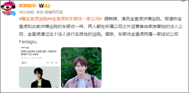 新浪娱乐据韩媒,演员金宣虎涉嫌逃税。报道称金宣虎和此前涉嫌逃税的车银优一样,两人都在所属公司之外运营着由家族掌控的法人公司,金宣虎通过这个法人进行实质性的逃税。