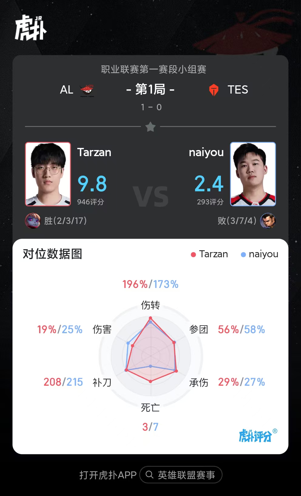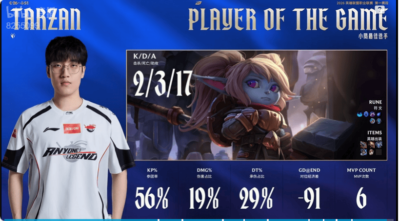 虎扑02月01日讯Tarzan波比打出2/3/17战绩,拿到AL对阵TES首局比赛MVP