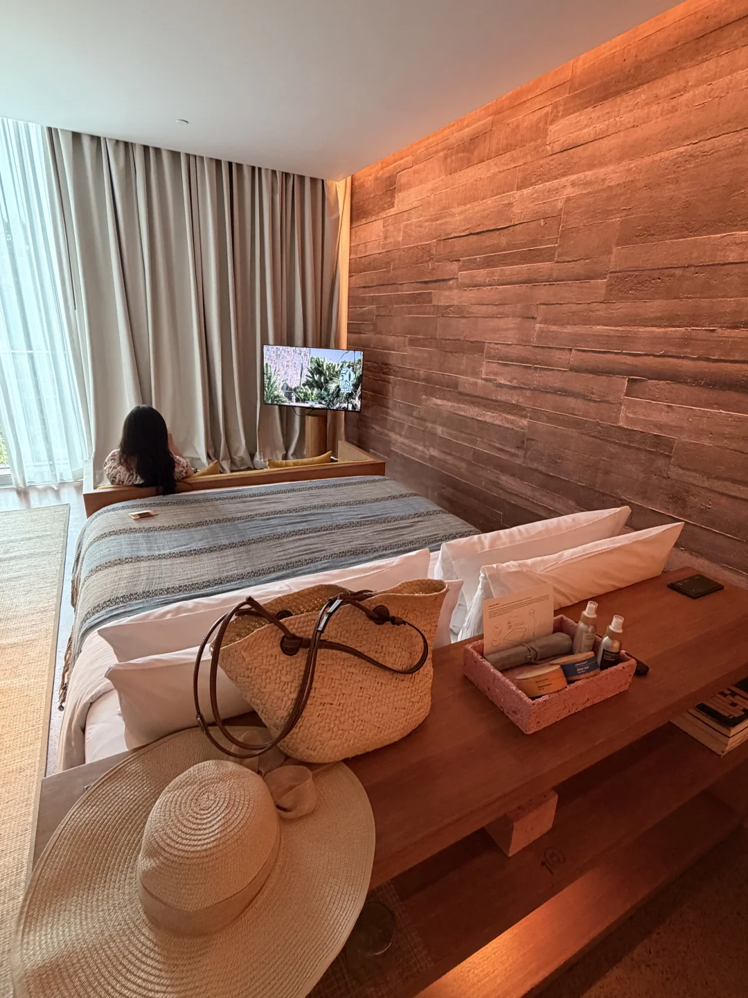 5、房间里面有大编织包和编织帽子可以拍照及使用 房间的浴袍颜色特别漂亮 想带走 不过好像不可以