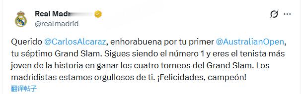 “亲爱的卡洛斯-阿尔卡拉斯,祝贺你赢得首个澳网冠军,这也是你的第七个大满贯冠军。你依旧排名世界第一,而且你是历史上最年轻的四大满贯赛事冠军得主,皇马球迷为你感到骄傲。恭喜你,冠军!”