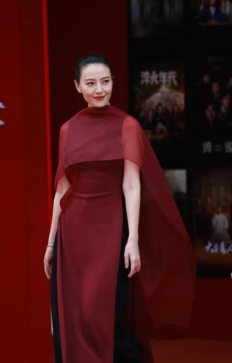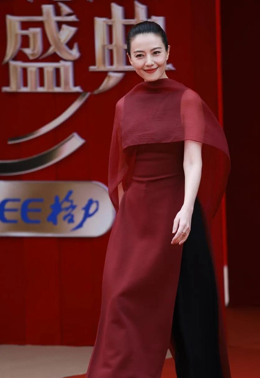 高圆圆丸子头杀疯了!💥 酒红拼黑长裙配丸子头,又美又飒,这状态我慕了!