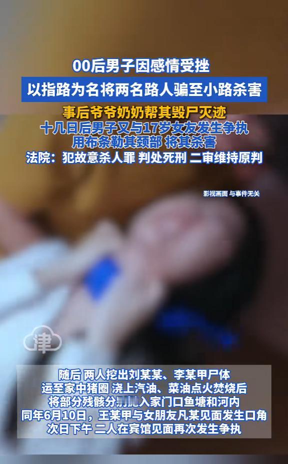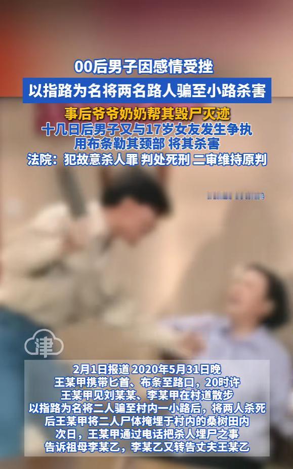 “必须严惩!”2020年5月,四川宜宾,一男子感情受挫,为了泄愤,竟将两名女子骗到偏僻小路残忍杀害,他的爷爷奶奶得知后,帮忙把尸体丢进猪圈和鱼塘毁尸灭迹,过了十几天,男子又与女友发生争执,最后活活将女友勒死!网友:十恶不赦! 近日报道,这件事发生在2020年5月31号晚上,宜宾的乡村小道已经暗了下来,王某甲因为感情上受了挫折,心里的怨气没地方撒,居然生出了报复杀人的念头。 他提前揣着匕首和布条,蹲在路口等着,专门盯着女性下手。 晚上8点左右,有两个女子刘某某和李某甲正在村道上散步,两人压根没意识到,危险正在向她们靠近。 王某甲装成热心人,凑过去跟她们说能指路,哄骗着把两人带到了村里一条偏僻的小路上。 等到了没人的地方,他立马露出了真面目,残忍地把这两个无辜的女子杀害了。 杀完人之后,他还算计着掩盖罪行,把两人的尸体埋在了村里的桑树田里,以为这样就能神不知鬼不觉。 可他没忍住,第二天就把自己杀人埋尸的事,打电话告诉了自己的祖母。 祖母听完之后,没有第一时间劝他自首,也没有报警,反而转头就把这件事告诉了老伴,也就是王某甲的祖父。 老两口一时糊涂,满脑子都是要保住孙子,居然做出了更荒唐的事。 他们趁着夜色,悄悄把桑树田里的两具尸体挖了出来,运到了自己家的猪圈里,又找来汽油和菜油浇在尸体上,点火焚烧,想要把尸体彻底销毁。 焚烧之后,他们还觉得不保险,又把没烧干净的残骸,分别扔到了家门口的鱼塘和附近的河里,一步步走向了违法的深渊。 本以为这件事能就这么瞒过去,可王某甲的暴戾之气,根本没收敛。 仅仅过了十几天,也就是6月10号,他和自己的女朋友凡某见了面,两人聊着聊着就吵了起来,言语不和闹得很不愉快。 转天下午,两人又相约在宾馆见面,争执变得更加激烈,王某甲再次失去了理智。 他拿出事先准备好的布条,先把凡某的双手反绑在身后,不让她反抗,然后用另一根布条,狠狠勒住了凡某的脖子,直到凡某没了呼吸,他才慌慌张张地逃离了现场。 后来法医鉴定,凡某是因为机械性窒息死亡的。 短短十几天,三条人命接连消失,这件事很快就被警方察觉,经过缜密侦查,王某甲很快被抓获归案,他爷爷奶奶帮忙毁尸灭迹的行为,也随之暴露。 2021年7月,宜宾市中级人民法院审理了这起案件,认定王某甲犯故意杀人罪,判处死刑,剥夺政治权利终身,后来二审也维持了原判,他的爷爷奶奶也因为包庇罪、帮助毁灭证据罪,受到了应有的惩罚。 说实话,这起案件让人既愤怒又惋惜,感情受挫确实让人难受,但这绝对不是伤害别人的理由,更不是剥夺无辜者生命的借口。 那两个散步的女子,和王某甲无冤无仇,只是偶然路过,就为他的极端情绪付出了生命的代价,太令人心疼了。 而他的爷爷奶奶,固然是疼孙子心切,但这份疼爱,彻底越过了法律和道德的底线。 他们以为帮忙毁尸就能保住孙子,却不知道,这样做不仅救不了他,反而会让自己也身陷囹圄,更是对受害者及其家属的二次伤害。愚昧和溺爱,最终酿成了无法挽回的悲剧。 法律从来不会纵容任何恶行,不管是故意杀人,还是包庇罪犯、毁灭证据,只要触碰了法律红线,就一定会受到严惩。 这起案件也提醒大家,遇到挫折要学会控制情绪,遇事多想想后果,更要守住法律的底线,不要因为一时糊涂,毁掉自己和别人的一生。 对此您有什么不同的看法,可以在评论区留言讨论!!! 信息来源:《男子感情受挫连杀两路人爷爷奶奶帮其毁尸灭迹后又因言语不和勒死女友》华商报