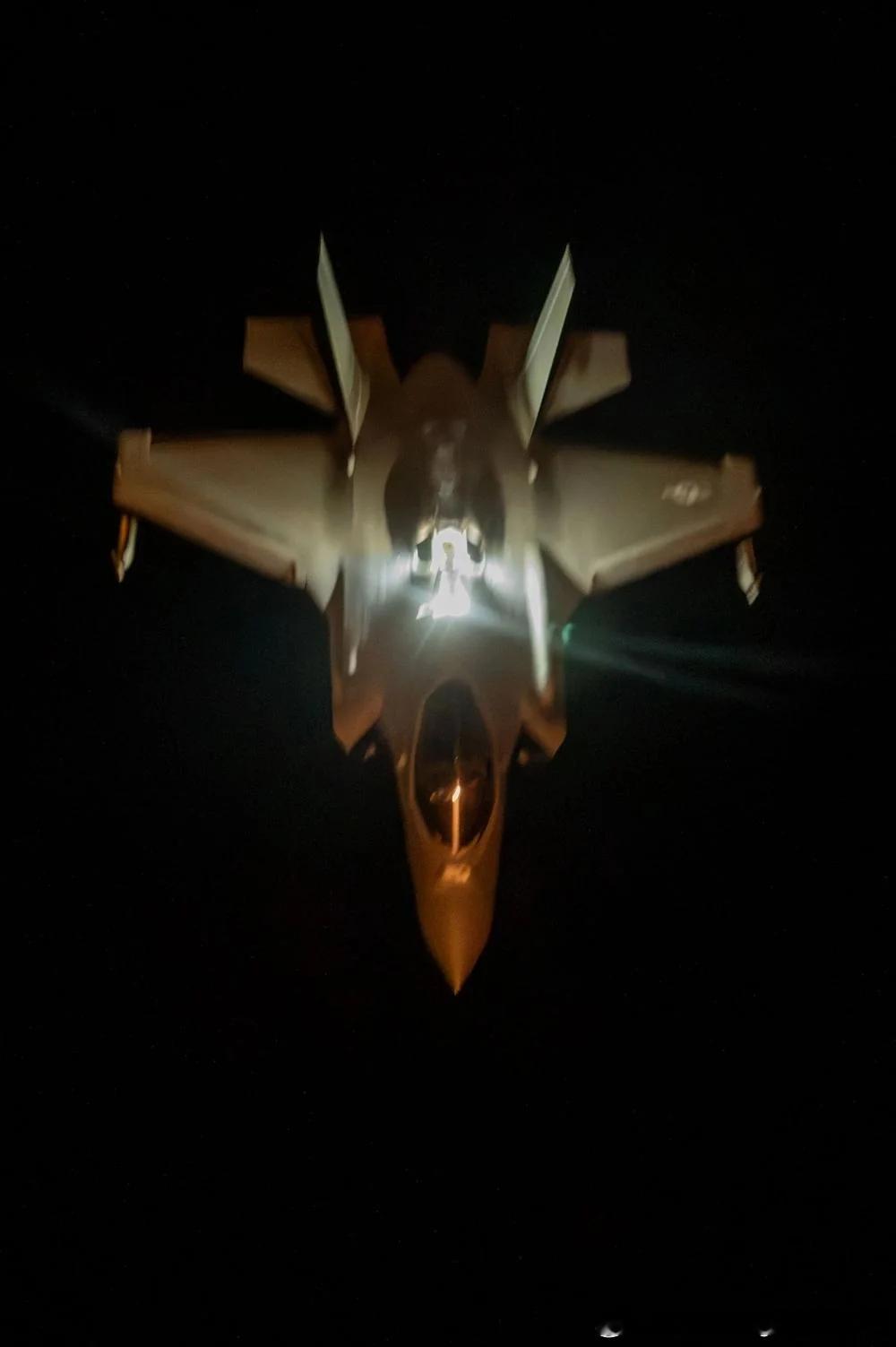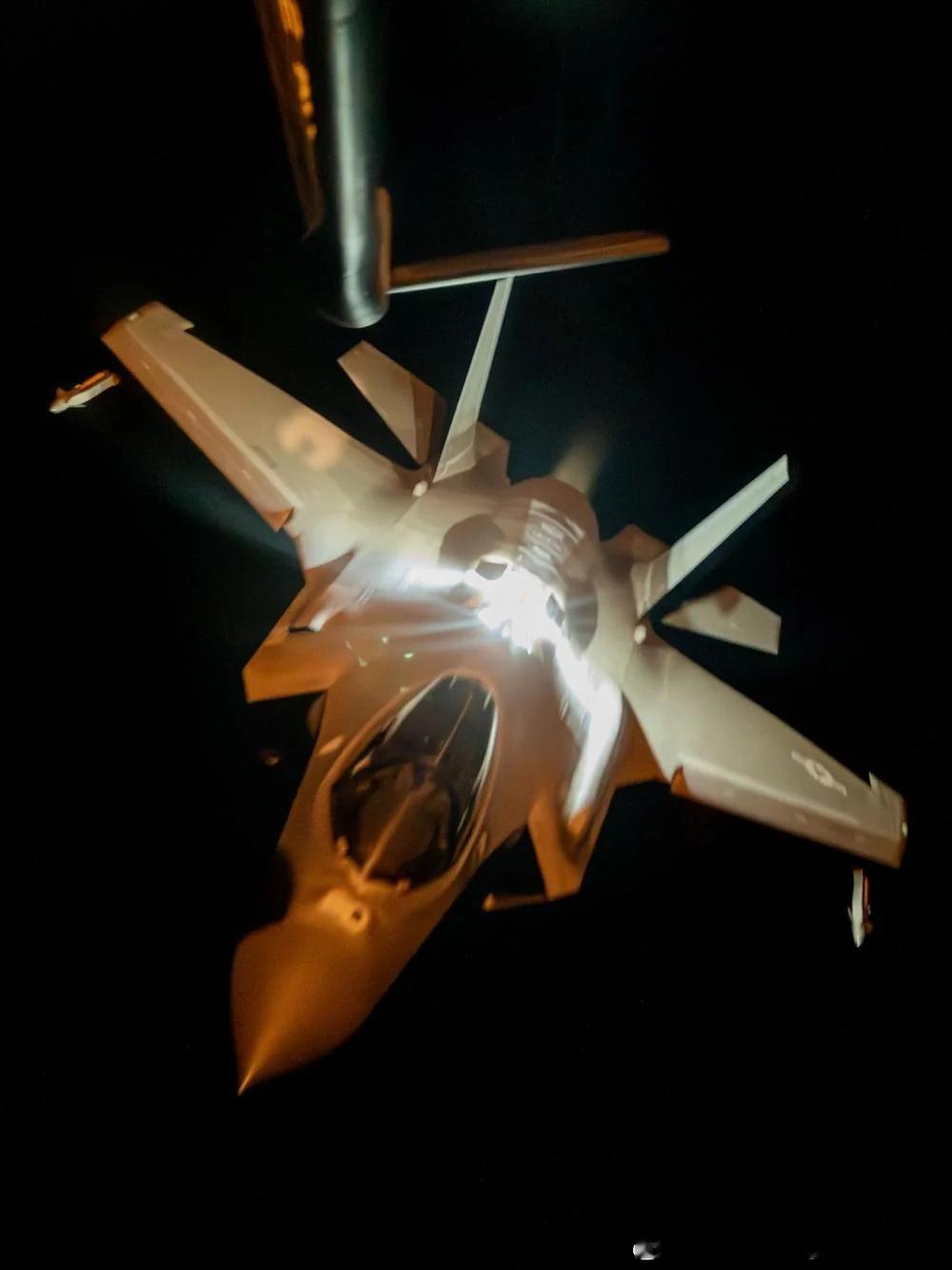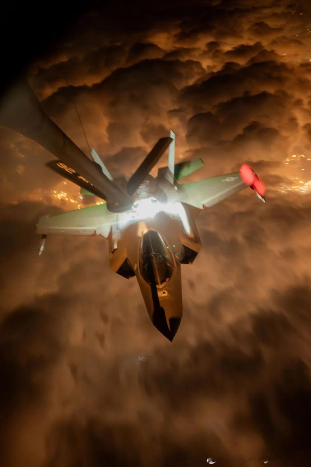 F-35A夜间空中加油,云层下方应该是城市。F-35A的硬管式收油插座内集成照明