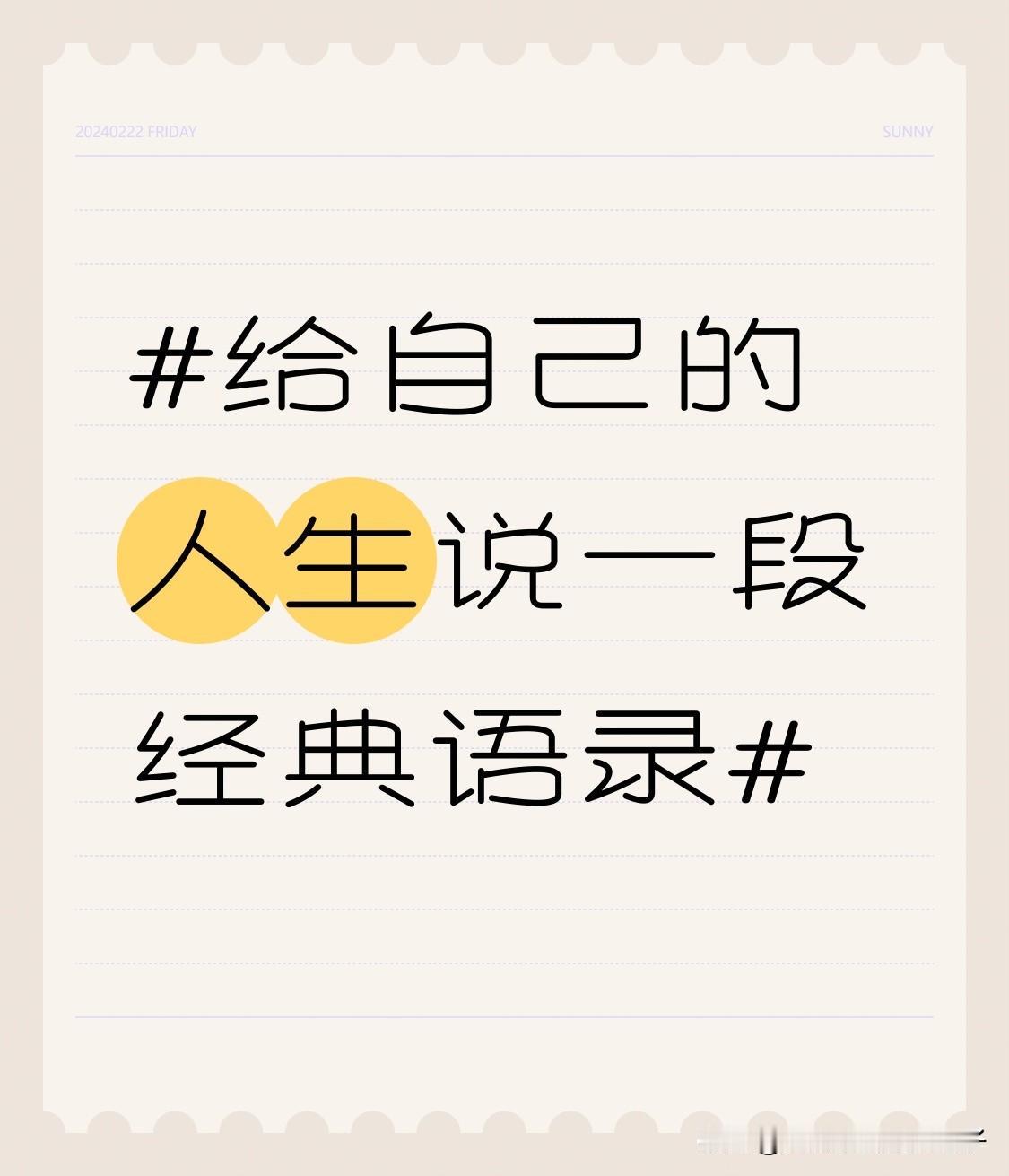 人生就像一场未知的冒险,我想对自己说:“心有暖阳,何惧风霜;行有定力,终至远方。”别让犹豫消耗时光,别让怯懦辜负梦想。低谷时沉淀,高峰时清醒,平凡日子里,守好自己的节奏。 生活是自己的,与其抱怨黑暗,不如点亮灯火;与其羡慕他人,不如深耕自己。接纳不完美的自己,包容不圆满的生活,不慌不忙,慢慢发光。所有的光芒,都来自日复一日的坚持;所有的幸运,都是脚踏实地的结果。认真过好每一天,便是最好的人生。