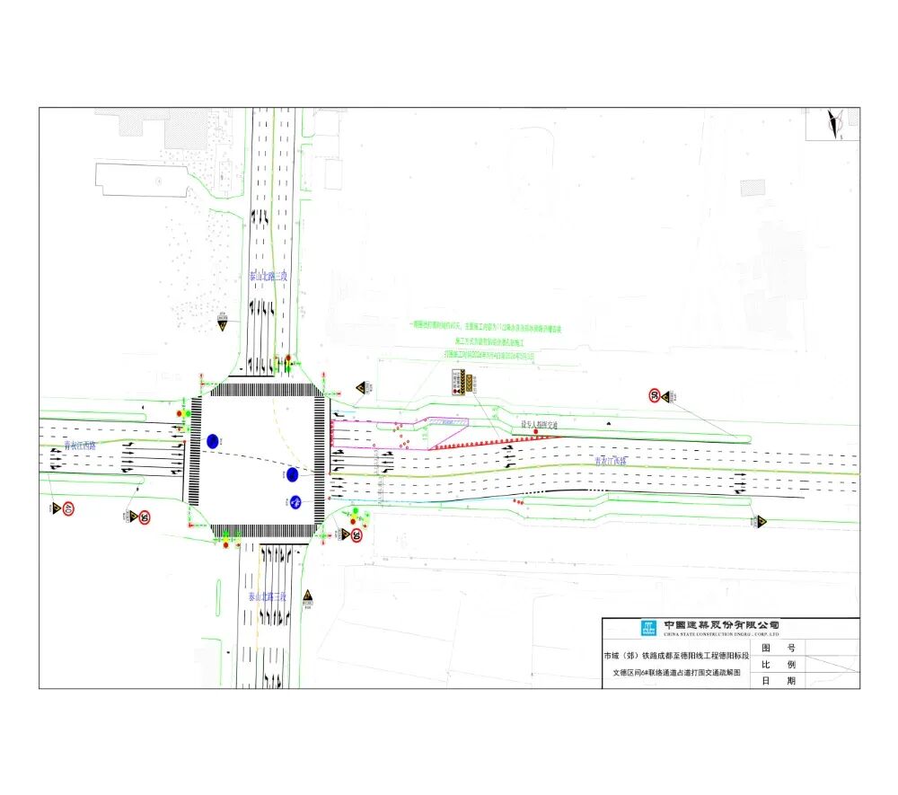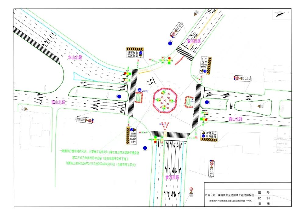 市域(郊)铁路成都至德阳线工程因联络通道施工,需在地面打围。打围位置一位于泰山北路与华山北路、黄河西路交叉路口,设置交通疏导用的环岛。计划打围施工时间为近期至2026年4月24日。