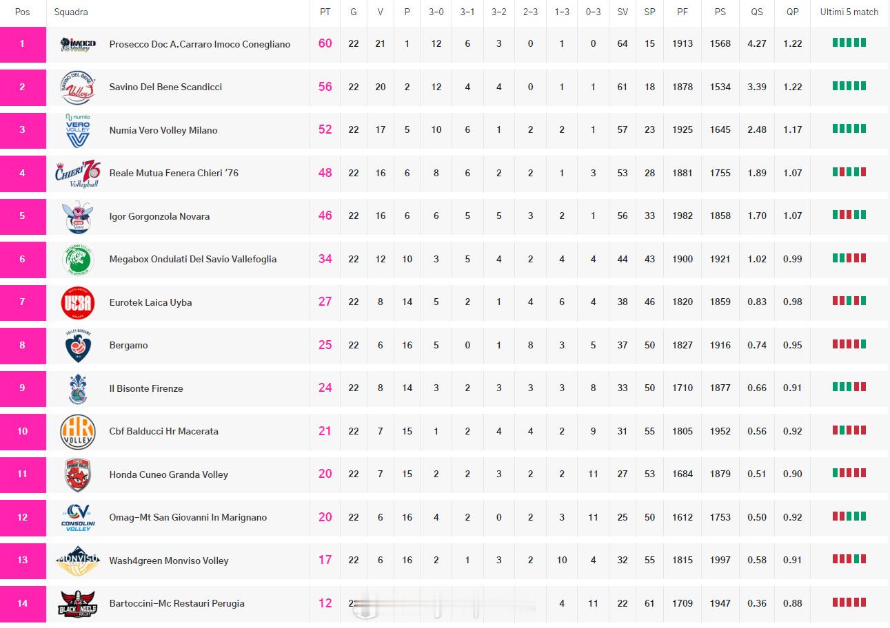 【意甲女排最新积分榜:圣乔瓦尼脱离降级区】国际排坛战报速递中国排球留洋动态 2月1日,意甲女排第22轮战罢,领头羊科内利亚诺60分继续领跑,斯坎迪奇56分暂列次席,米兰、基耶里和诺瓦拉分列3-5位,圣乔瓦尼在三连胜后终于脱离降级区、升至倒数第三,佩鲁贾和皮内罗洛排名倒数两位。