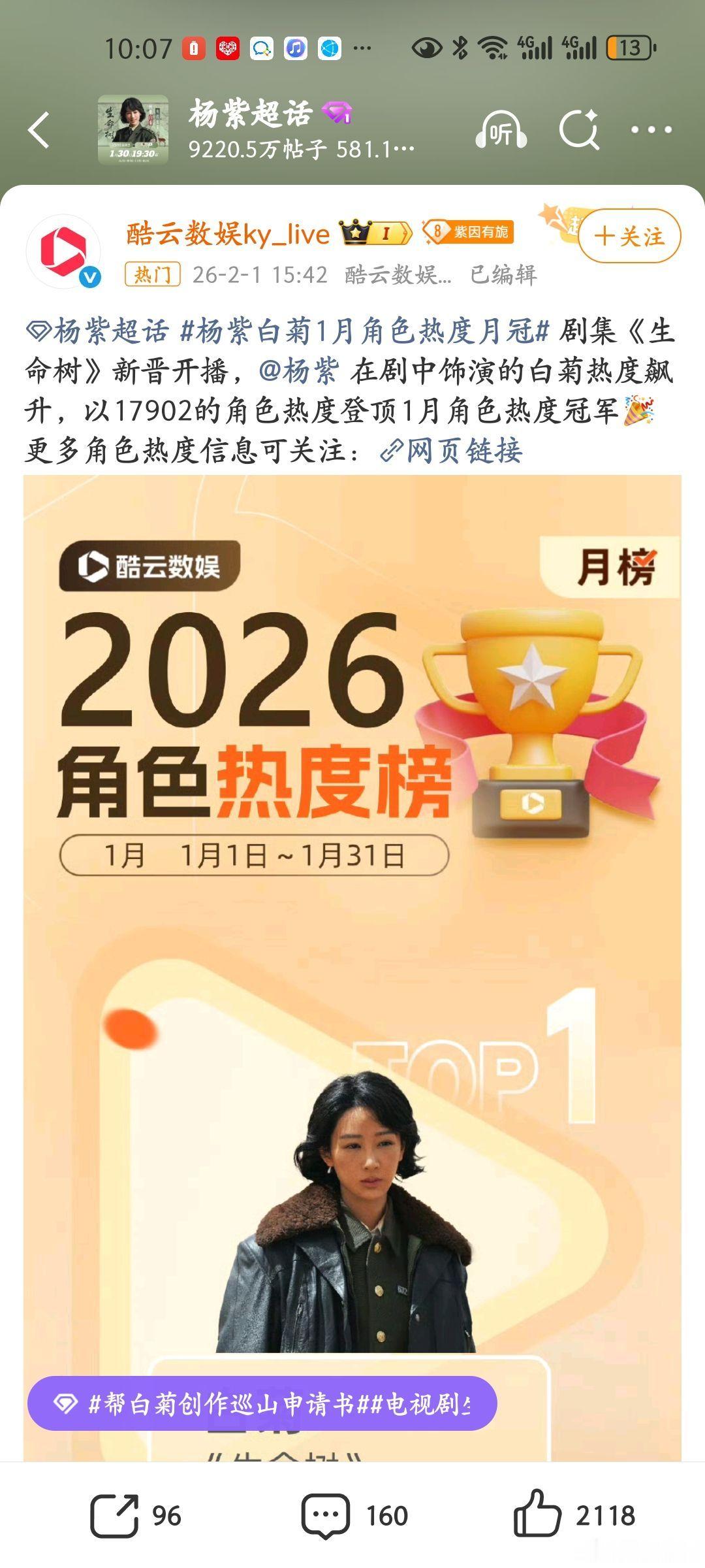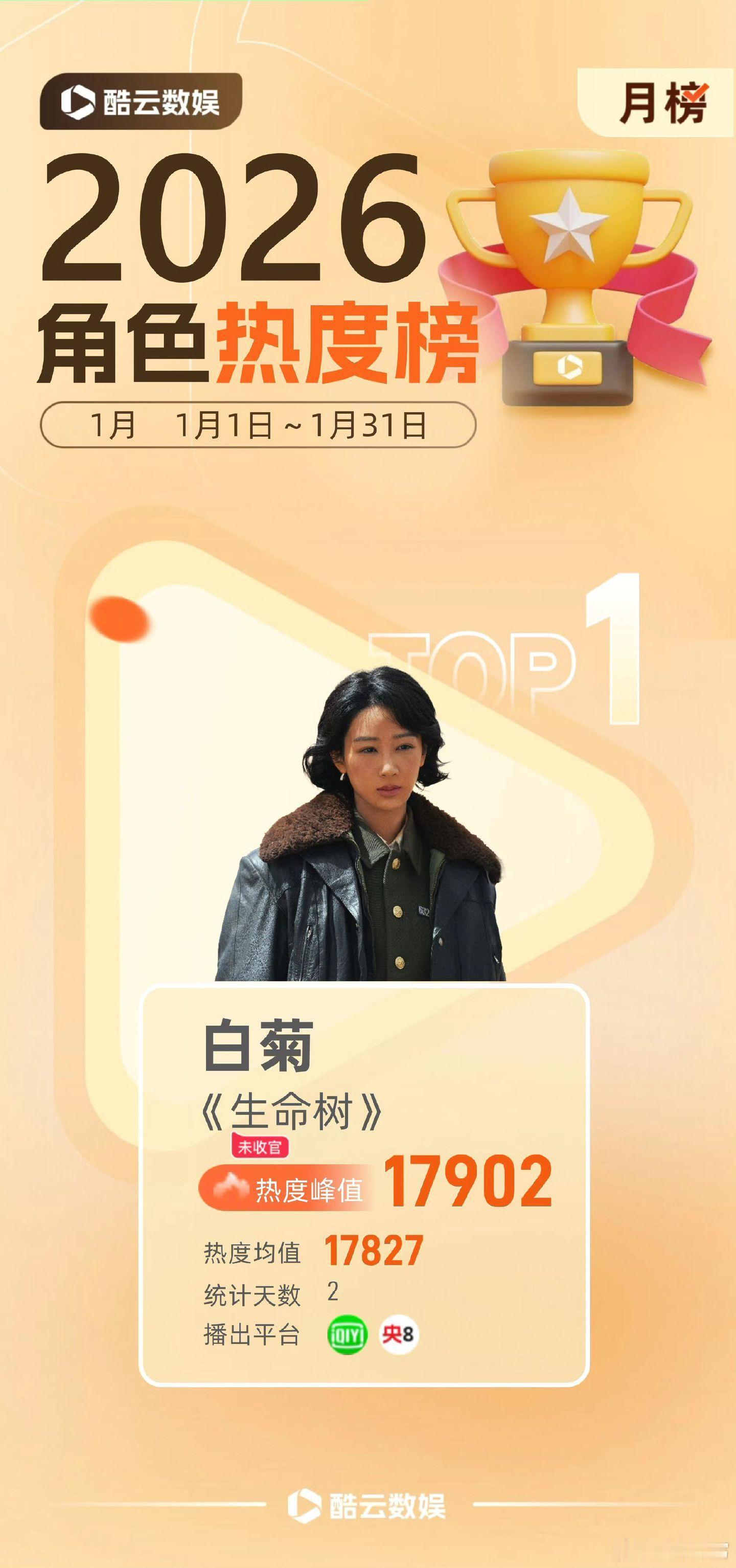 热播剧角色热度TOP1生命树杨紫白菊1月角色热度月冠 剧集《生命树》新晋开播,在剧中饰演的白菊热度杨紫[超话]杨紫白菊1月角色热度月冠 剧集《生命树》新晋开播,在剧中饰演的白菊热度飙升,以17902的角色热度登顶1月角色热度冠军