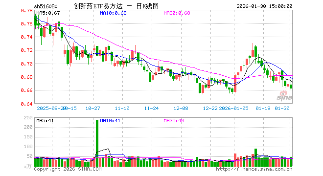 1月30日,创新药ETF易方达(516080)跌1.05%,成交额3105.98万元。当日份额增加1700.00万份,最新份额为17.76亿份,近20个交易日份额增加3.10亿份。最新资产净值计算值为11.72亿元。