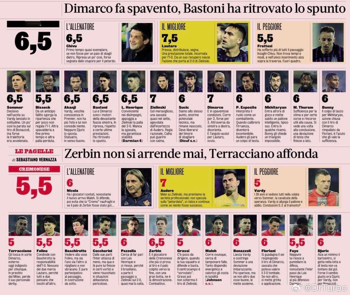 米兰体育报赛后评分如下克雷莫内塞0比2国际米兰国际米兰热点现场 劳马最佳 弗拉泰