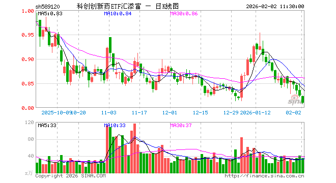 2月2日,截止午间收盘,科创创新药ETF汇添富(589120)跌1.82%,报0.810元,成交额2837.96万元。科创创新药ETF汇添富(589120)重仓股方面,百济神州截止午盘跌1.08%,艾力斯跌1.63%,百利天恒跌1.43%,君实生物跌2.17%,泽璟制药跌1.82%,博瑞医药跌1.62%,荣昌生物跌2.41%,特宝生物涨0.03%,益方生物跌7.63%,皓元医药跌4.67%。