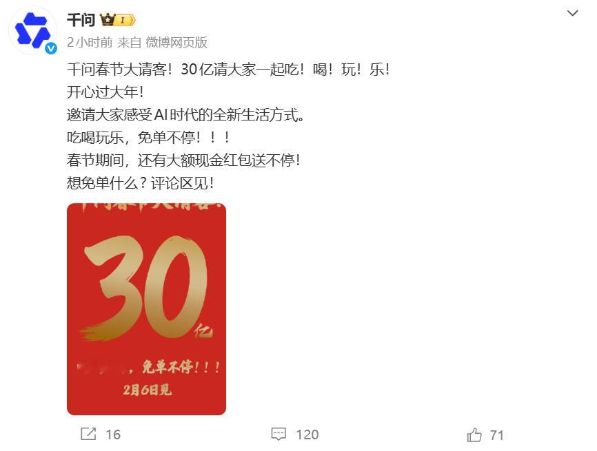 千问宣布春节30亿免单吃喝玩乐 说真的,阿里这次是真的把AI生态玩明白了~30亿砸进春节吃喝玩乐免单,还是阿里史上春节最大投入,并于2月6日正式上线。