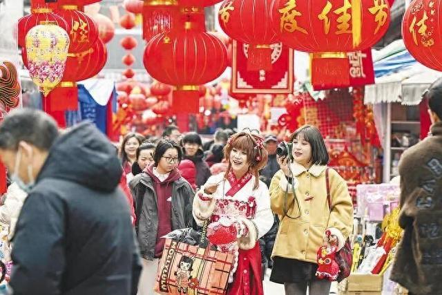 2月1日,在城隍庙,市民正在选购新年饰品。春节临近,合肥城隍庙市场内挂满了大红灯笼、春联、中国结、马年饰品等节日饰品,吸引了不少市民前
