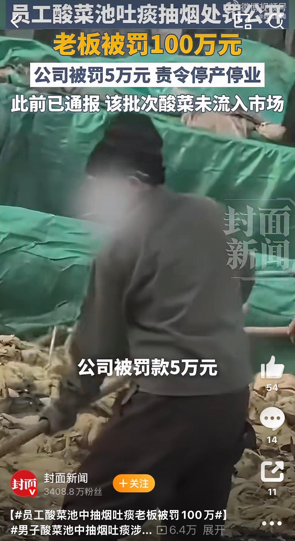 员工酸菜池中抽烟吐痰老板被罚100万酸菜爱好者碎了一次又一次……