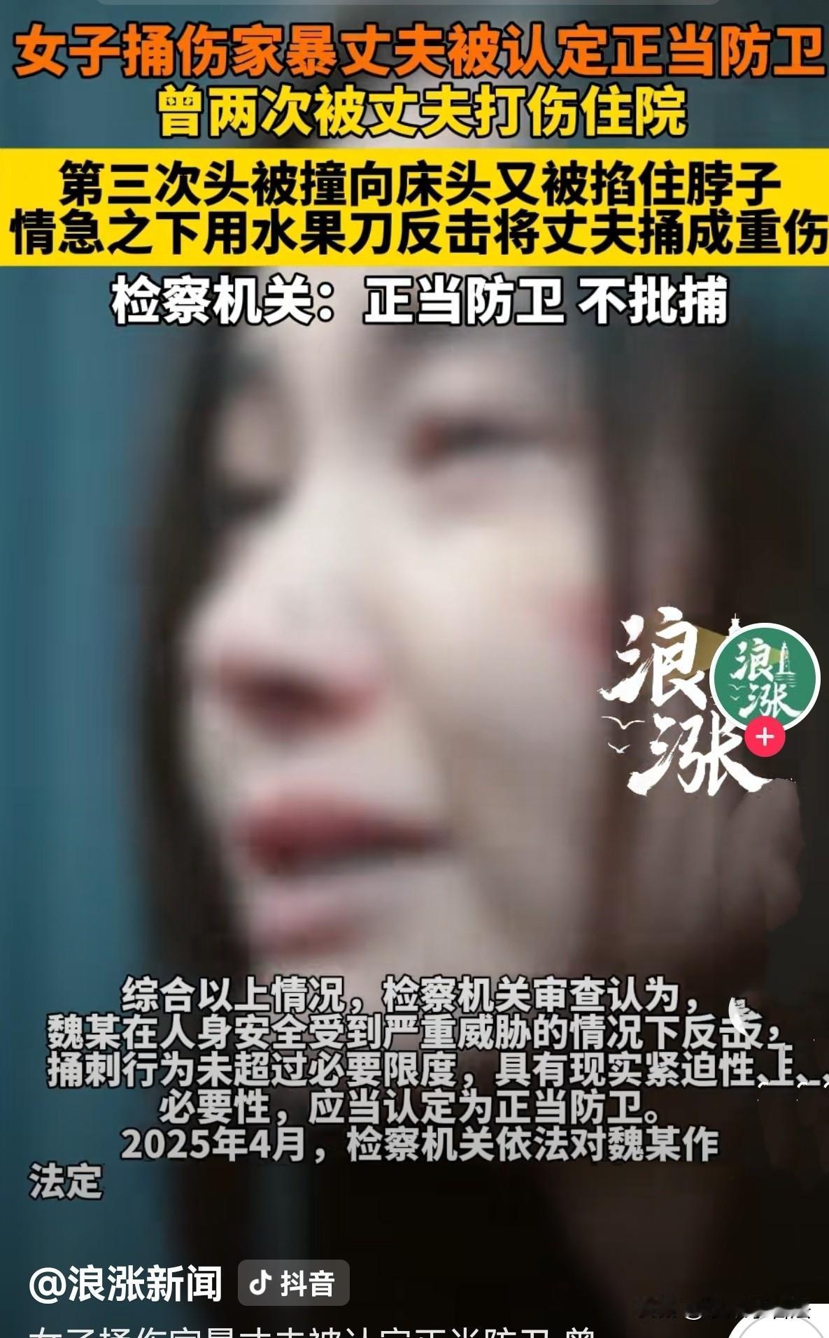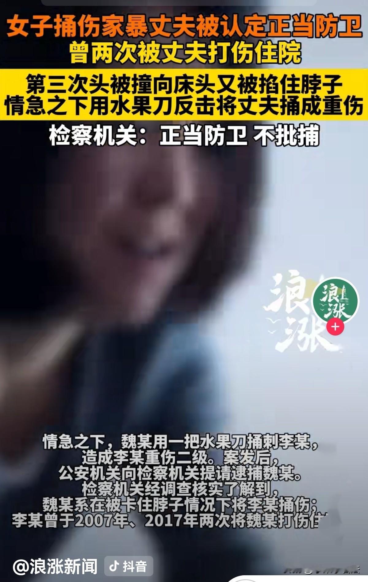 “兔子急了还咬人呢!”湖北,女子与丈夫结婚十几年,曾被2次打伤住院,尽管她小心翼翼,仍逃不过丈夫家暴,这日,又因琐事两人发生争执,丈夫把家砸个稀巴烂,女子吓得不敢出声,以为事就过去了,没想到第二天凌晨,丈夫再次发飙,抓起女子头发撞向床头,而后有又掐她脖子,女子憋的脸色苍白,感觉快没气了,情急之下她摸到水果刀捅向丈夫。造成其重伤二级。女子被警方以涉嫌故意伤害提交检察院,而检方经调查,给出的结果让人直呼解气! 魏某和李某结婚十几年里,日子过得像踩在蛋壳上,稍微不留意就会引爆丈夫的怒火。 2025年3月的一天,不过是些柴米油盐的琐事,李某就翻了脸,指着魏某的鼻子骂骂咧咧,顺手就抄起桌上的杯子砸在地上,玻璃碎片溅了一地。 接着,他像疯了一样打砸家里的家具,沙发被踹得歪歪扭扭,茶几的玻璃面裂成了蜘蛛网,魏某缩在墙角,吓得浑身发抖,连哭都不敢出声。 这样的场景,在她的婚姻里早已不是第一次,她想着他发脾气,自己不吱声就可以躲过家暴的劫难。 谁也没想到,噩梦在第二天凌晨继续发酵。夫妻俩躺在床上,前一天的矛盾还没消解,李某又翻旧账挑起争吵。 没等魏某辩解几句,李某突然动了手,右手猛地薅住魏某的头发,撞在床头的木板上,一阵剧痛袭来,眼前瞬间发黑。 还没等她缓过神,李某粗壮的手指已掐住了她的脖子,力道大得像要把她的喉咙捏碎。 这时她连哀求的声音都发不出去,她感觉自己喘不过气来,脸憋的都不过血了,她觉得自己可能要死了! 窒息感越来越强烈,呼吸变得困难,眼前的李某面目狰狞,她能感觉到自己的意识在一点点模糊。 求生的本能让她在慌乱中摸索,摸到了床头柜上一把平时用来削水果的小刀。那一刻,她没有任何思考的余地,只想挣脱这致命的束缚,握着刀就朝李某身上捅了过去。 李某掐着脖子的手终于松开了,魏某瘫坐在床上,大口喘着粗气,等她缓过来,看着李某身上流着血,自己手里握着的刀,整个人都懵了。 她将刀扔在地上,慌忙打了报警电话。 很快,公安机关就介入了调查。李某被送往医院救治,经鉴定构成重伤二级。 魏某因为涉嫌故意伤害罪,被公安机关提请检察机关批准逮捕。 魏某觉得自己完了,虽丈夫一直打她,但自己将他捅伤了,肯定得坐牢!想到自己这些年受的委屈,再想到可能面临的牢狱之灾,她整日以泪洗面,甚至有了轻生的念头。 但检察机关并没有简单地根据伤情下结论。 办案检察官在审查案件时发现,这起看似普通的伤害案,背后藏着长期的家庭暴力。 通过调取医院病历、询问证人,检察官了解到,魏某并不是一时冲动,而是长期遭受李某的暴力对待。 早在2007年和2017年,李某就曾两次将魏某打成重伤,让她住进医院,每次都是伤好后,在李某的哀求或威胁下,魏某为了家庭和孩子选择了隐忍。 没想到这成了魏某的软肋,换来的是李某的变本加厉的伤害,她越忍气吞声,李某越暴躁,打骂成了家常便饭。 更关键的是,案发时的情况并非魏某主动攻击,而是在脖子被掐、生命受到严重威胁的紧急情况下,才采取的反击行为。 《刑法》第20条第3款规定:对正在进行行凶、杀人、抢劫、强奸、绑架以及其他严重危及人身安全的暴力犯罪,采取防卫行为,造成不法侵害人伤亡的,不属于防卫过当,不负刑事责任。 检察官反复核查证据,还原案发经过:李某先动手推撞魏某,又实施掐脖子的致命行为,魏某的捅刺行为是为了制止正在进行的不法侵害,而且没有超过必要的限度,完全符合正当防卫的构成要件。 2025年4月,检察机关作出了法定不批准逮捕的决定。 当听到这个消息时,魏某忍不住失声痛哭,这一次,是解脱的泪,是感激的泪。 随后,公安机关依法作出撤案处理,魏某终于不用再面对牢狱之灾,也终于摆脱了那个让她恐惧了十几年的男人。 有人说,渣男活该有如此下场!忍无可忍,无需再忍!法官判的太好了! 有人说,女人都2次打进医院,还不离婚?这样的男人本性难移,一辈子也改不了!还等着打进太平间不成? 还有人说,这样的男人注定会孤独终老,残爆无情, 都说家暴零容忍!您对家暴这个问题怎么看?