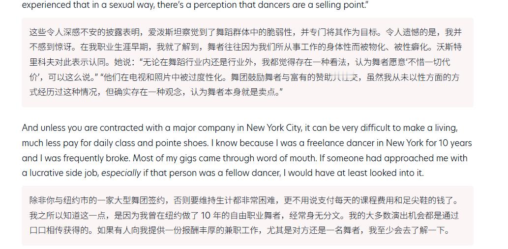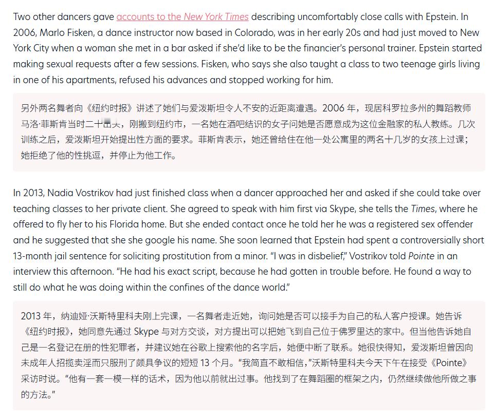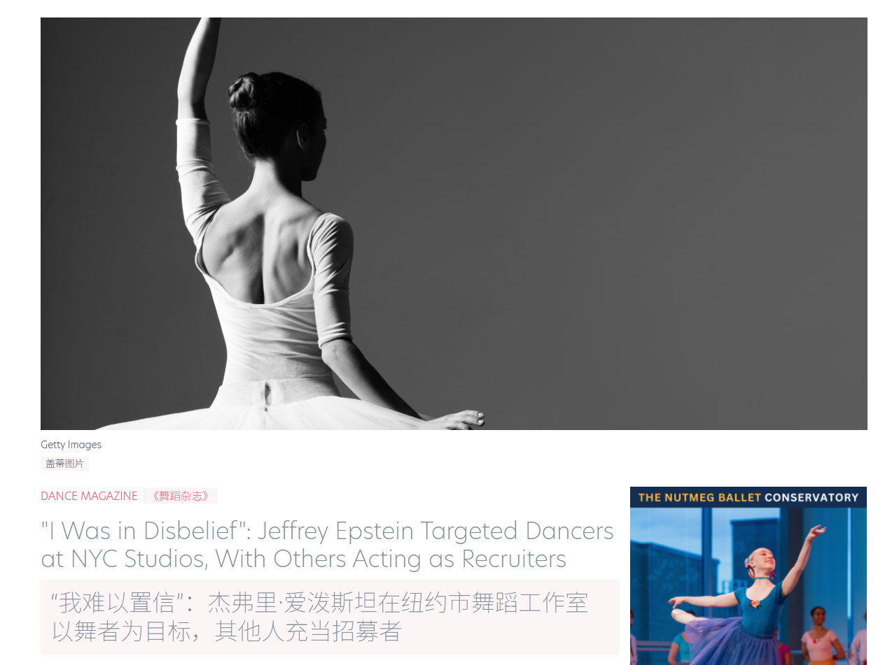 🔻2018年,爱泼斯坦通过他的慈善组织Gratitude America Ltd.向位于立陶宛维尔纽斯的一家芭蕾舞剧院捐款 $28,543美元。🔻该机构被描述为“ballet theater in Vilnius, Lithuania”,在线企业目录显示其名称为Baltic Ballet Theater(波罗的海芭蕾剧院)。🔻这笔捐款是爱泼斯坦在被捕前不久的几笔国际捐款之一,其他包括法国和意大利的一些组织。🔻爱泼斯坦对芭蕾舞界的兴趣和捐款有更广泛的背景,他曾多次向舞蹈机构捐款(例如美国佛罗里达的Ballet Florida),并有报道指他利用舞蹈工作室作为招募小姑娘的场所。专门针对脆弱的年轻舞者,以胁迫手段迫使她们,暗示只要顺从他的要求,凭借他的财富和人脉就能帮助她们推进舞蹈事业,若拒绝,则会毁掉她们的职业生涯。诉讼称,当这些小姑娘开始显得“年纪过大”时,他要求她们从自己就读的舞蹈工作室招募更年轻的舞者。🔻图为Dance Magazine杂志 2019年的一篇报道。🔻作者说:“这些令人深感不安的披露表明,爱泼斯坦察觉到了舞蹈群体中的脆弱性,并专门将其作为目标。令人遗憾的是,我并不感到惊讶。在我职业生涯早期,我就了解到,舞者往往因为我们所从事工作的身体性而被物化、被性癖化。沃斯特里科夫对此表示认同。她说:“无论在舞蹈行业内还是行业外,我都觉得存在一种看法,认为舞者愿意‘不惜一切代价’,可以这么说。他们在电视和照片中被过度性化。舞团鼓励舞者与富有的赞助人社交,虽然我从未以性方面的方式经历过这种情况,但确实存在一种观念,认为舞者本身就是卖点。”🔻“除非你与纽约市的一家大型舞团签约,否则要维持生计都非常困难,更不用说支付每天的课程费用和足尖鞋的钱了。我之所以知道这一点,是因为我曾在纽约做了 10 年的自由职业舞者,经常身无分文。我的大多数演出机会都是通过口口相传获得的。如果有人向我提供一份报酬丰厚的兼职工作,尤其是对方还是一名舞者,我至少会去了解一下。”🔻“但我相信,爱泼斯坦觊觎的不仅仅是我们的经济困境——舞者在踏入这个竞争极其激烈的行业之初,往往都很年轻、充满渴望。而且众所周知,这个职业到处都是镜子、工作机会稀缺、几乎时时刻刻都伴随着批评性反馈,这些因素都会加剧自卑感。沃斯特里科夫对《纽约时报》网站上一些指责那两名持续遭到爱泼斯坦性剥削的舞者的评论感到心寒。他编织了一个由复杂关系、套路和联系构成的完整网络,制造出一种虚假的信任感,然后滥用它来得到他想要的东西,沃斯特里科夫说。我也许拒绝过,但事实是,他还是找到了我,也还是找到了那个招募我的女孩。这才是最令人作呕的地方。他操纵了我们舞者之间那种如同家庭般的内在情感。”特朗普回应被爱泼斯坦案文件提及爱泼斯坦 吃人海外新鲜事热点现场