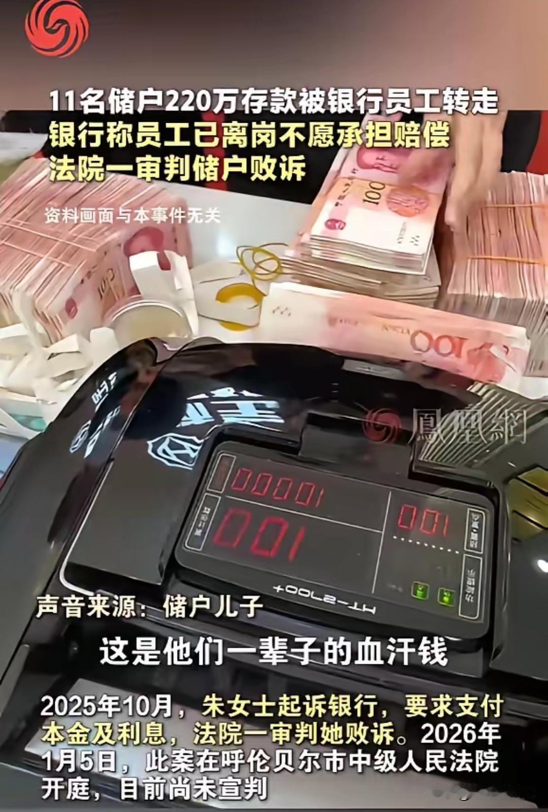 75万存银行凭空清零,储户维权一审遭驳回 女子存75万血汗钱,取款时账户分文不剩。 2021年7月,内蒙古扎兰屯朱大姐携75万现金到银行办理存款,柜员孟某芝身着工装接待,借代办业务获取证件与密码,私下将资金转入私人账户,全数挥霍。孟某芝用相同套路,先后骗取11名储户共计220余万元,事发后因诈骗罪被判12年,名下无资产,实打实赔不出一分钱。 2025年10月朱大姐起诉涉事银行,银行以孟某芝已离岗为由,主张涉案行为属个人犯罪,与机构无关。一审法院采信该说辞,判定银行无过错,朱大姐官司栽了,维权陷入僵局。 2026年1月5日,呼伦贝尔中院二审开庭审理本案,截至2026年2月初,判决结果尚未公布。银行内部监管如同漏风的筛子,员工在岗离岗权限管控失效,大额资金异动无预警核查,是案件发生的核心诱因。二审法庭围绕机构履职过错展开质证,司法裁判倾向大概率向储户权益倾斜。 此事后续走向,评论区说说你的看法。存款减少真相