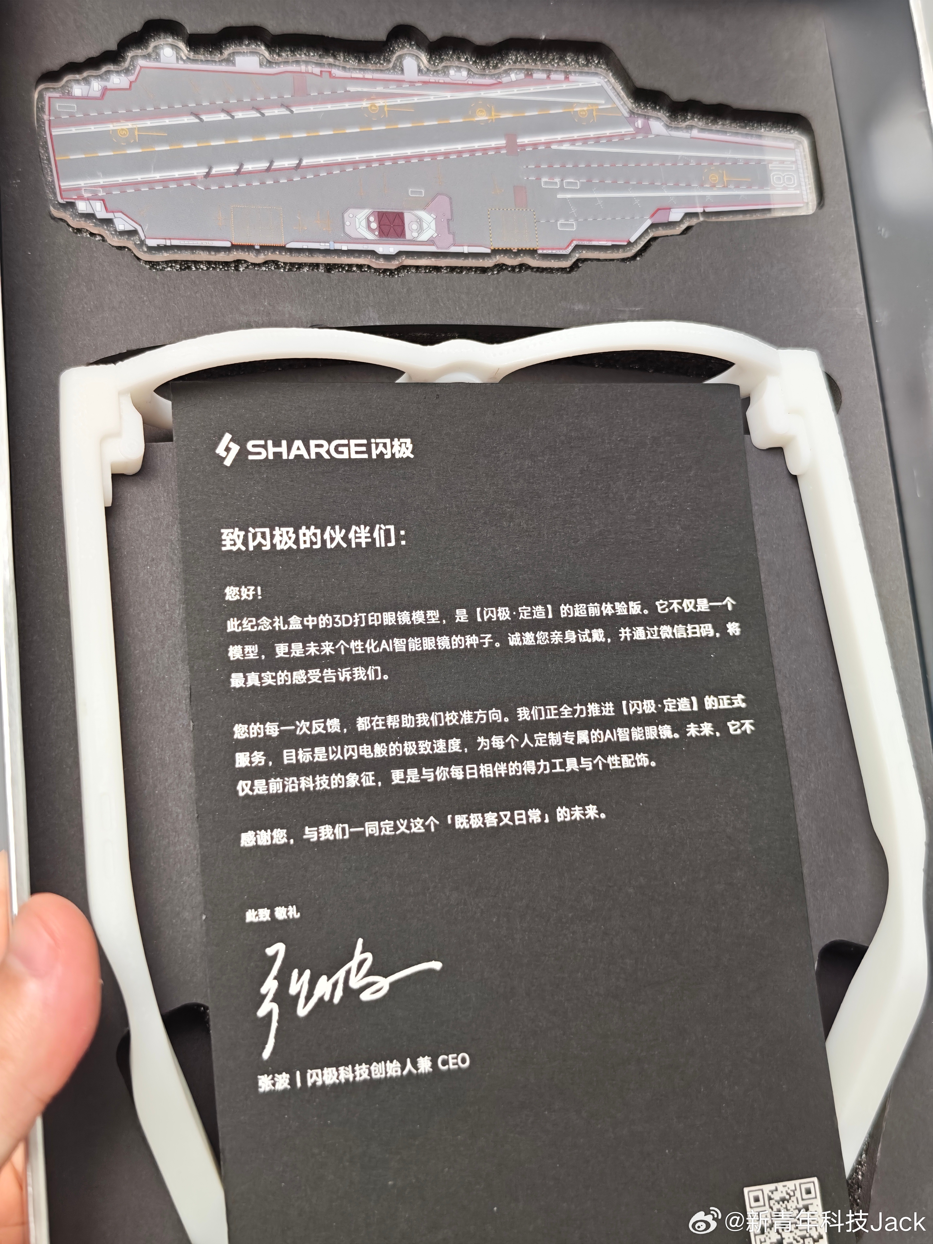 闪极纪念礼盒挺有意思,先是给自家新款AI眼镜预热,做了个3D打印眼镜框用来给意向用户试戴,后面还有定制专属款,可以期待一下闪极AI眼镜新动作。