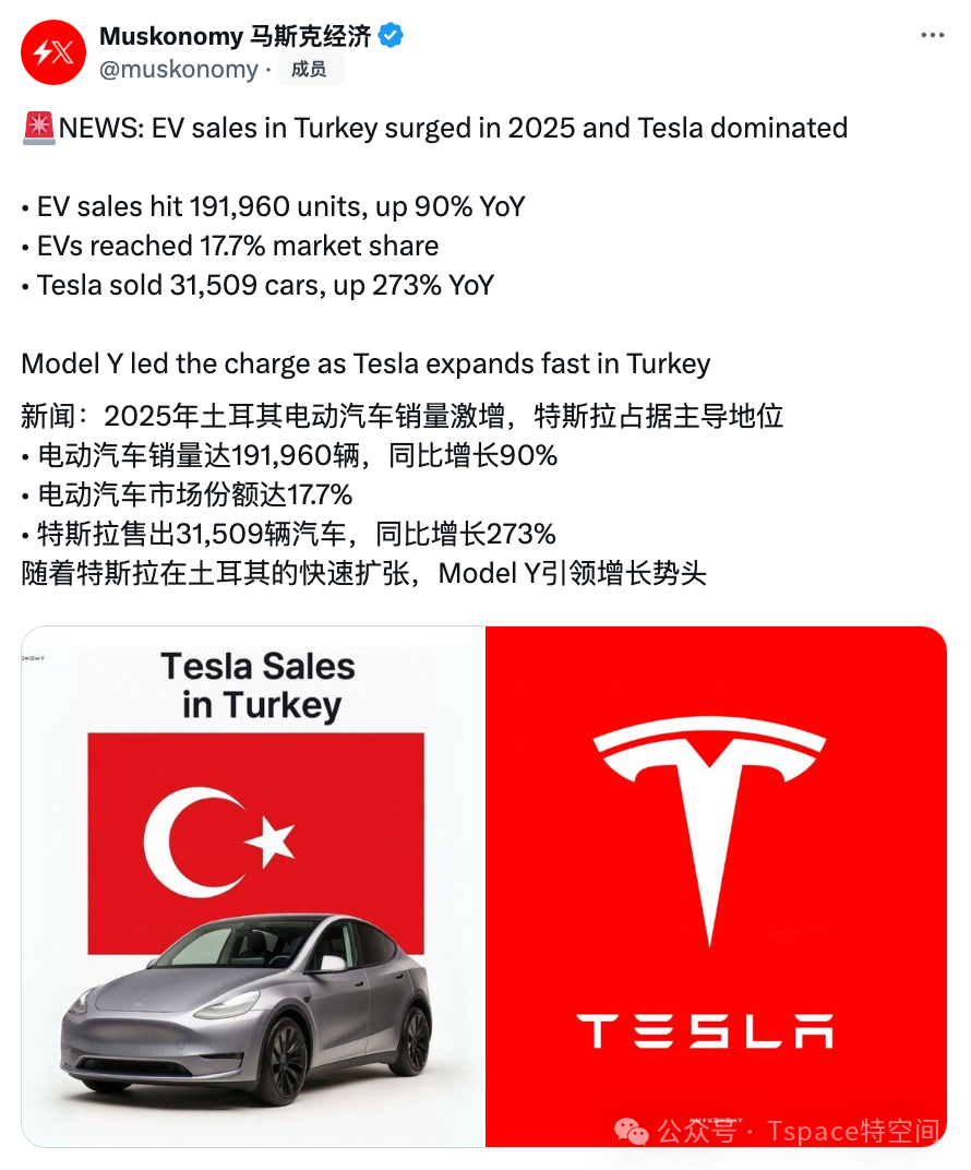 特斯拉2025年在土耳其销量暴涨273%,Model Y是当地卖得最好的纯电动车