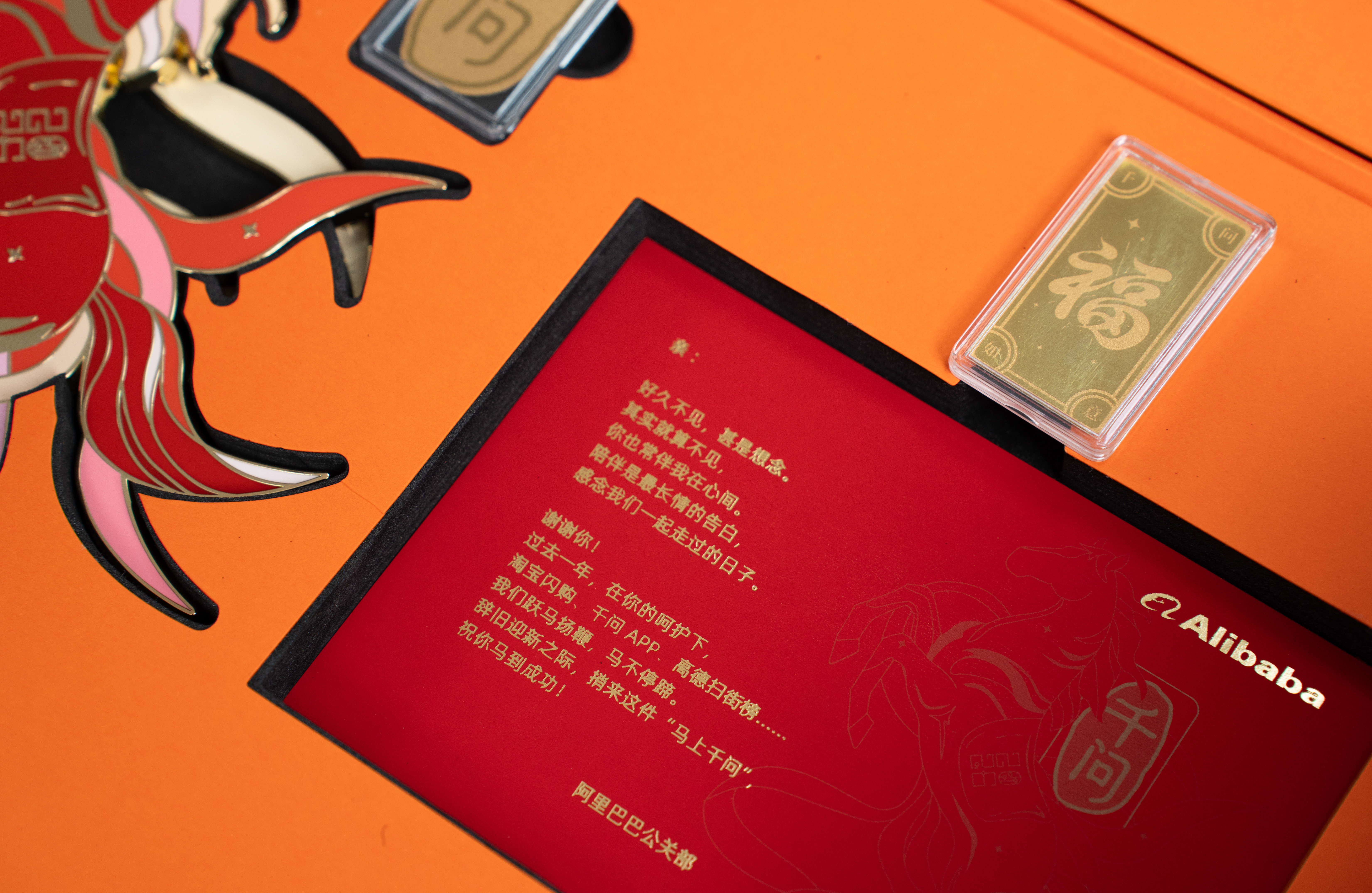收到阿里巴巴2026马年新年礼盒,橙金配色质感拉满!“马上千问”的金属摆件设计巧