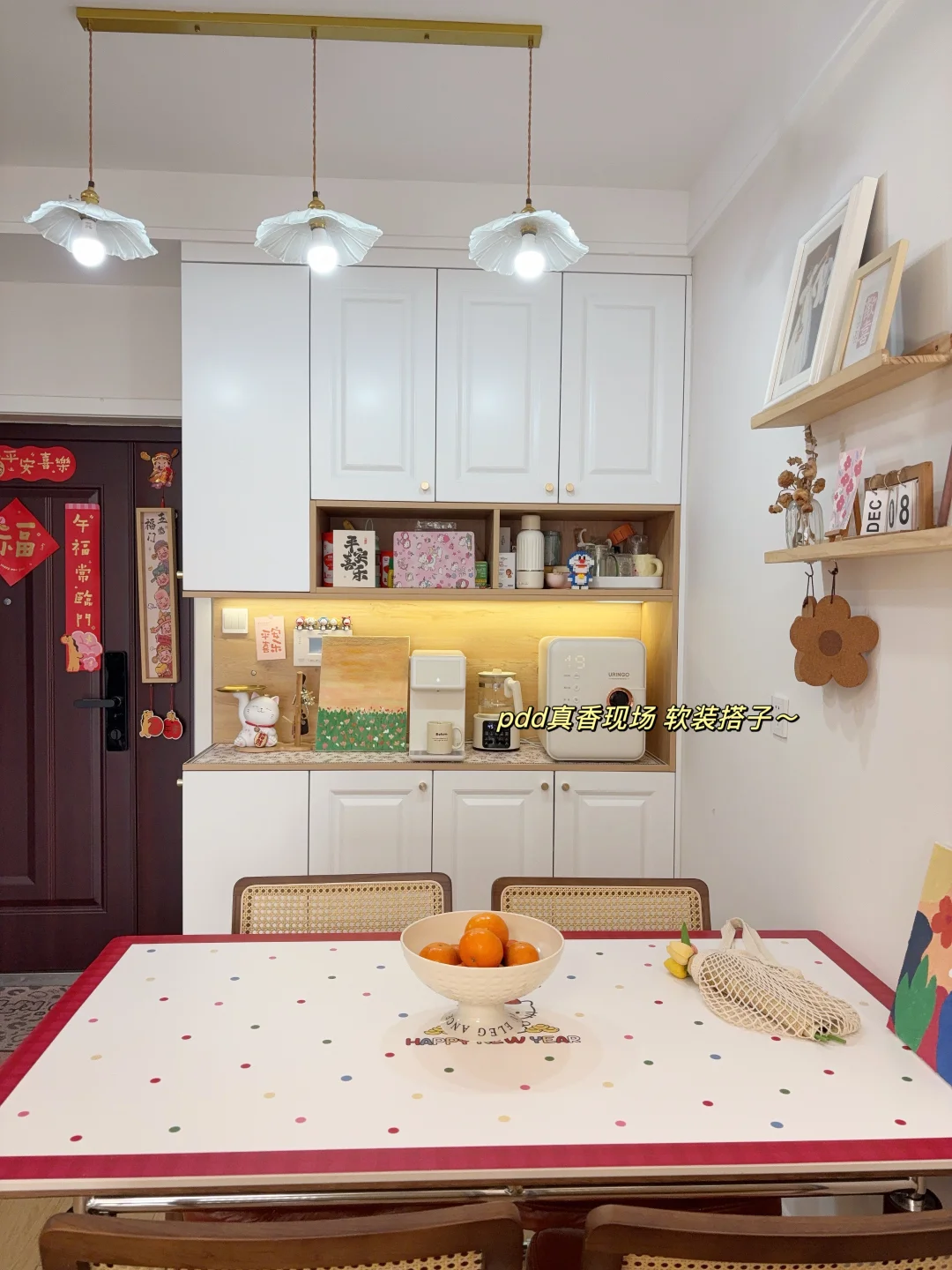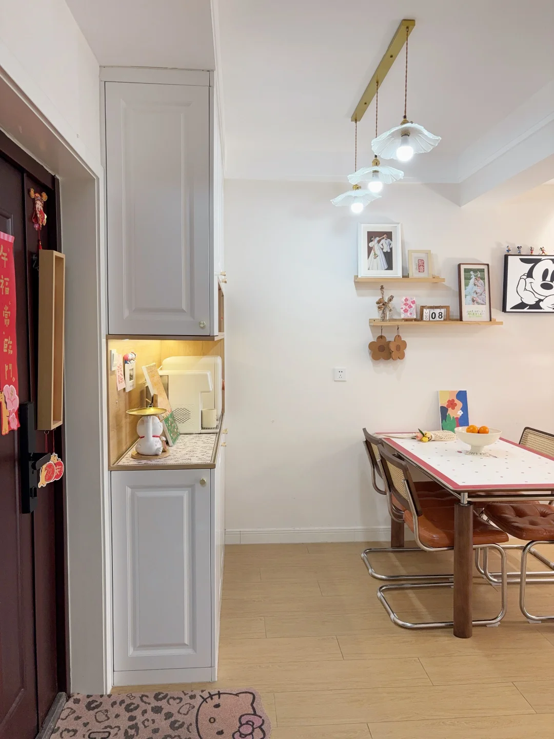 我家进门左边是客餐厅 右边是厨房 鞋柜餐边柜一体设计 侧面打开是鞋柜正面餐边柜 满足日常收纳~ 家里的软装就是在pdd一点点拼凑的 一整个家就是那种温柔的感觉 越住越爱💓