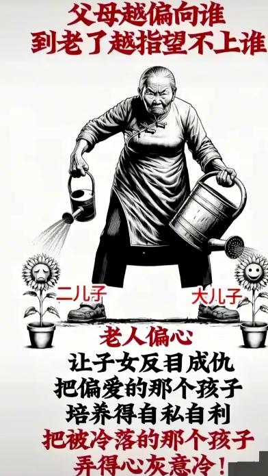 当你发现老人偏心,你会怎么做?今天我来告诉你,记住这两点,你就赢了,信不信由你 当年我满怀期待成为老公家的一员时,婆婆的举动让我一度怀疑自己的选择,那那时候只要我说结婚需要什么?婆婆就会给老公说,“你哥结婚的时候就没有”,后来我们有了孩子,婆婆整天带着老公9岁的侄女上学,也不帮我照顾生病的孩子,在我娘家爸妈的照顾下,孩子勉强会走了,有一次孩子生病肚子疼的哇哇叫,一连好几天都好不了,后来没办法我把在外打工的老公叫了回来,最可恨的是,孩子肚子疼的一直哭,一家人都好像听不见,婆婆还让老公帮忙干活,我一气之下就和老公大吵一架,婆婆还说我不懂事,从此我发誓在不需要婆婆照顾孩子,自己生的自己养,老公看我是真的生气了,才带着我和孩子去县城给孩子看病,就这样我离开了那个偏心的家庭,一年到头很少回去,回来听说,每次哥哥嫂子只要一吵架,我婆婆就去给嫂子说好话,照顾她们一家大小,可怜我的孩子两岁半就送进了幼儿园,我就自己边上班边带孩子,如今孩子大了,她们也老了,总是一到放假就打电话说想孩子,大家说说虚伪不虚伪,偶尔老公会回去看看,我从来不说什么?毕竟是老公的爸爸妈妈,他应该尽孝,但对于我来说,我能提供的尽量提供,但千万别对我的生活指手画脚,当初偏心老大,就别怪我不回家尽孝,当初你帮了谁?在你需要照顾的时候就去找谁?我受罪的时候你看不见,那么,你生病了也别找我,我不是救世主,更不是菩萨,我知道我这么做可能很多人都说我心太狠,可谁知道我一个人抱着孩子一夜一夜没睡觉的狼狈。 所以对待老人偏心,我总结了两点:一远离不生气,不内耗,想办法把自己的小日子过好;二有事别找我,谁受益谁负责,不要被道德绑架,这不是小心眼,这是最基本的平衡,我这么说不知道会有多少人赞同,又有多少人说我不孝?你对老人偏心怎么看?欢迎评论区里聊一聊