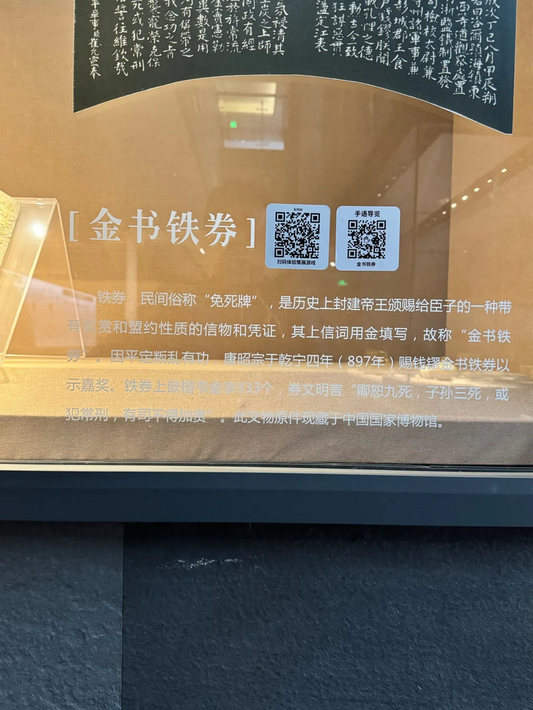 图片拍摄于浙江省杭州市博物馆 吴越开国君主钱镠的丹书铁券(金书铁券/钱王铁券),它是现存唯一唐代铁券实物,国博镇馆级国家一级文物。 一、颁赐背景与时间 唐昭宗乾宁四年(897年8月4日),为表彰钱镠平定董昌叛乱、维护唐室的大功而御赐;当时钱镠任镇海、镇东两军节度使,是晚唐朝廷笼络强藩的政治举措。 二、形制与铭文 • 外形:覆瓦状(筒瓦形),长52cm、宽29.8cm、厚0.4cm;铁质,金字嵌铭 • 铭文:正文333字,末行17字落款;核心条款:钱镠本人免九死,子孙免三死;常刑有司不得加责;文末以“长河似带、泰华如拳”为誓 • 工艺:铁铸后镂刻文字,再填嵌真金,即“金书铁券” 三、千年传承与坎坷 1. 吴越纳土归宋(978)后,铁券入宋廷御览,后仍归钱氏 2. 宋元明清多次入宫呈览(朱元璋曾仿其形制造明代铁券;乾隆作《观铁券歌》) 3. 屡遭战乱,曾沉井、流落民间,数度失而复得 4. 1959年由钱氏后人捐赠,现藏中国国家博物馆 四、历史价值 1. 唯一唐代铁券实物,是研究唐代政治、法制、藩镇史的一手材料 2. 见证晚唐中央与藩镇的关系,以及吴越钱氏保境安民、世代传承的家风 3. 古代“铁券制度”的巅峰遗存,对后世明清朝廷的铁券形制影响深远