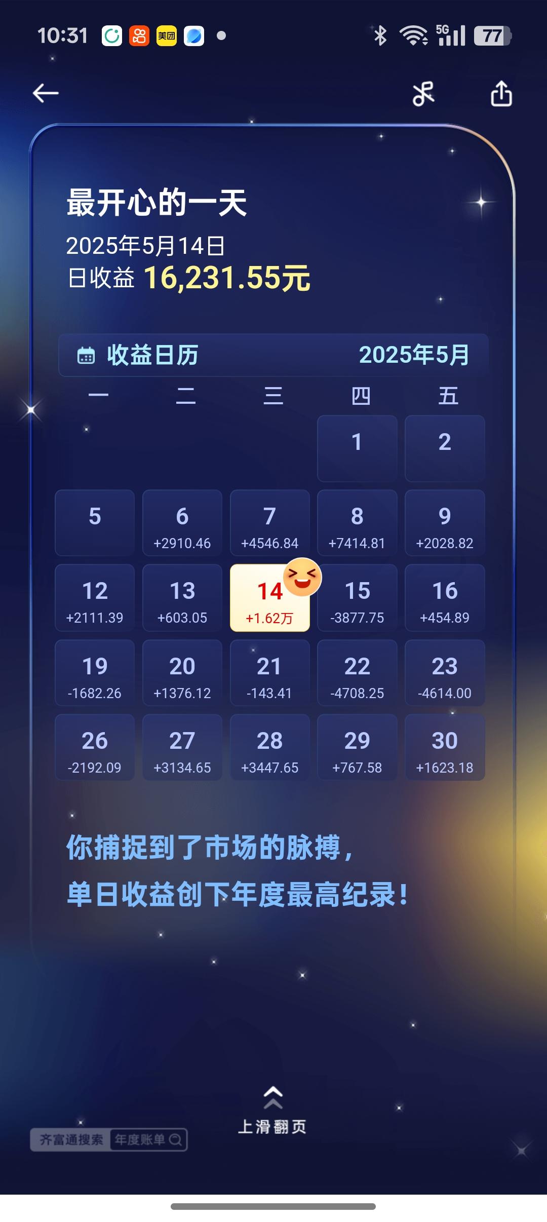 为什么多数人炒股都是亏钱的?在过去的2025年,我的收益率达到17.66%,跑输了沪指的18.41%。由于特不靠谱乱加关税,造成4月7日那天发生最大亏损,达到39814元。5月14月反弹最大的一天,涨16281元。如果谁能打特不靠谱一顿,我愿意把这些钱赞助他。
