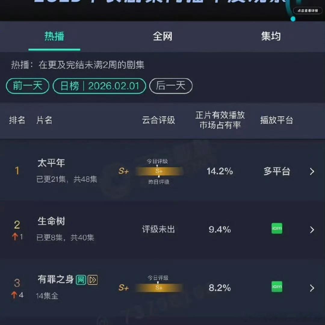 有罪之身8.2%有罪之身云合评级有罪之身云合8.2%,云合评级S➕, 14集全程