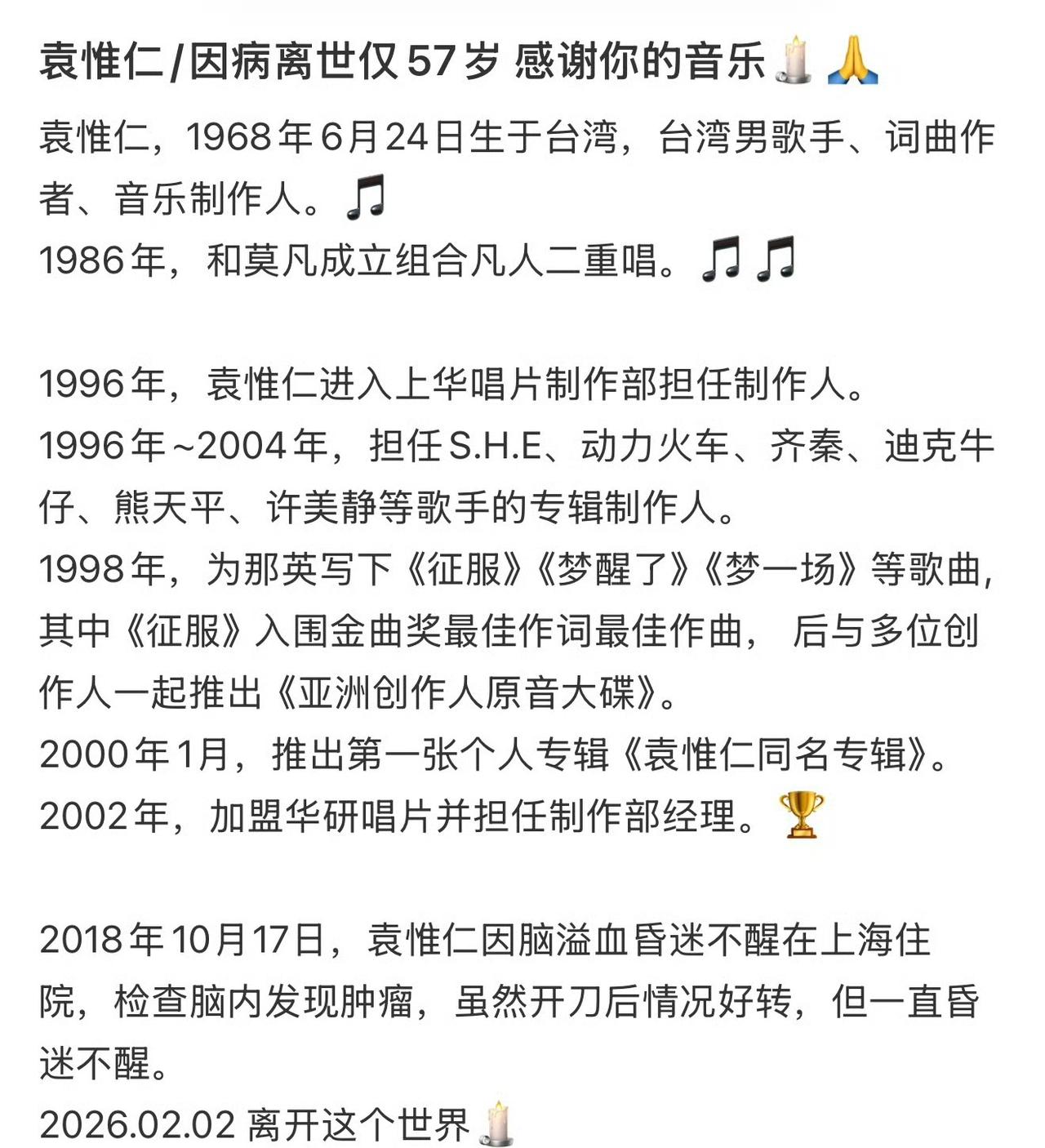 袁惟仁的代表作,你听过哪些。 原来这么多好听的歌都出自袁惟仁之手啊! 流传最广的是那英唱的《征服》, 前六首都堪称经典,甚至是经典中的经典,华语乐坛的顶尖之作! 我最喜欢赵传演唱的《勇敢一点》, 我试着要勇敢一点,虽然你已不在我身边~ 在任何时候都会让人泪流满面又能感觉到温暖的歌~ 很久没有听到这么好的词曲了,袁惟仁老师的离开,是华语乐坛的一大损失。