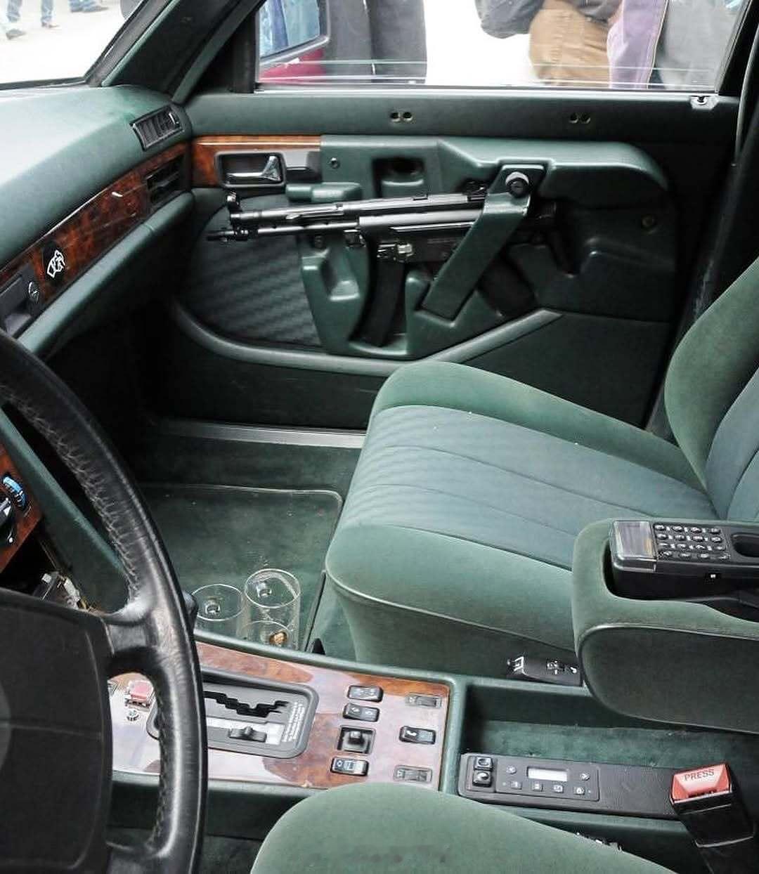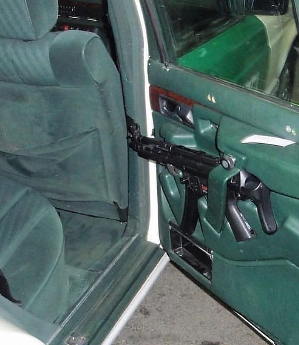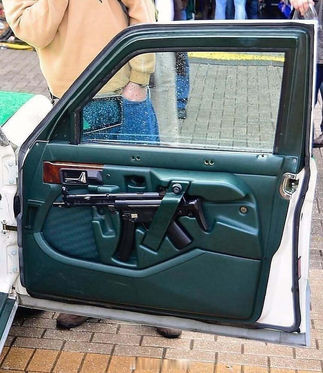 没用的知识又增加了。奔驰W126 420SE警车前后车门上藏着的MP5,卡槽看上去能够适配2种枪托
