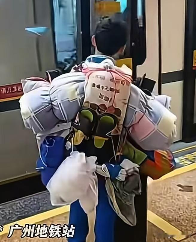 初二男生自己扛被子坐地铁回家,行李里有竹席书架和“大湾鸡”玩偶。他没哭没喊,也没人直播,就那么一路走、换乘、等爸爸接。事情不大,但很多人看愣了。 广州地铁7号线长洲站,1月30号下午,他背着个快赶上半个人高的包出闸机。镜头拍得挺实,没加滤镜,也没配悲情音乐。包带勒红肩膀,他喘了两口气,把拖鞋从包侧袋掏出来换了。旁边阿姨问“家长呢”,他说“我爸在B口”。 他叫何梓睿,黄埔军校纪念中学初二学生。宿舍到地铁站步行四分钟,他走熟了。暑假就开始练打包,用绳子在客厅地板上模拟怎么塞被子、挂蚊帐、固定竹席书架。家里没逼他,妈妈只报了个国防夏令营,回来他就自己缝补妹妹的蚊帐,线歪了也不重来。 有人说他穿500块球鞋,就不算真独立。可鞋是去年生日礼物,他自己洗、自己刷,鞋带断了还拿旧T恤剪条布条接上。老师说他数学作业常写“梗”,字漂亮,解题步骤比标准答案多两行——写的是怎么想到的,不是只写结果。 学校半军事化,但不是喊口号那种。早自习前叠被子,值日生轮着记行李清单,同桌帮他把“大湾鸡”玩偶塞进最软的夹层。老师不检查,只问:“明天去广州南站,你带哪三样必须品?为什么?” 他爸没上前帮忙,就在B口柱子后面站着,手机举着拍了三秒视频,发家庭群,写:“崽自己来的。”没加表情,没配文。妈妈回了个“嗯”,又补一句:“蚊帐补好了,线头我剪了。” 网上吵“穷养富养”,其实他家不穷也不富。爸妈上班,妹妹上幼儿园,阳台种着几棵小葱。他初二前学洗袜子,初一暑假拆过旧书包再缝,针脚像蜈蚣爬。能力不是突然长出来的,是每天拧瓶盖、系鞋带、算地铁换乘时间,一点点攒的。 有人看他走路背影说“心酸”。但他到家第一句是“冰箱西瓜切了吗”,吃完西瓜还主动擦了桌子。他讲不出大道理,只说:“不麻烦爸妈,心里轻松。” 他背包带断过一次,自己用胶带缠好,第二天又断,就改用晾衣绳穿洞加固。没说苦,也没说酷,就当这事该这么做。 这事儿火得有点快,但其实没啥稀奇。他只是做了许多小孩被拦着不让做的事。 他放下包,喝了口水,坐小板凳上给“大湾鸡”玩偶捏了捏肚子。