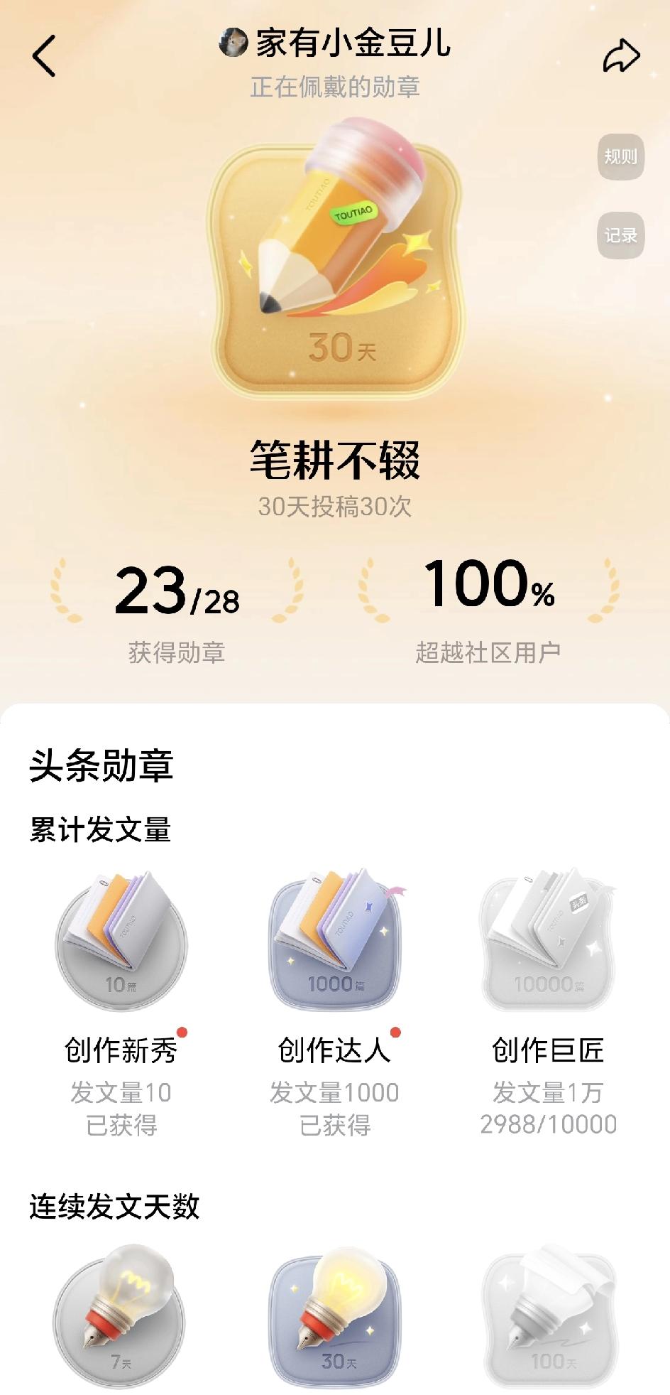 在头条写作两年多,收到了第一个实体奖章! 今日头条品鉴官,金灿灿的,甚是好看[大笑]! 两年多的日子说长不长说短不短, 现在回过头来看,我都难以相信自己是怎么做到的! 两个月达到最高级别LV4头条品鉴官称号! 总阅读量突破千万, 日均发文数量5+, 总收益1.8W+ 不知道还能坚持多久, 为自己加个油吧!