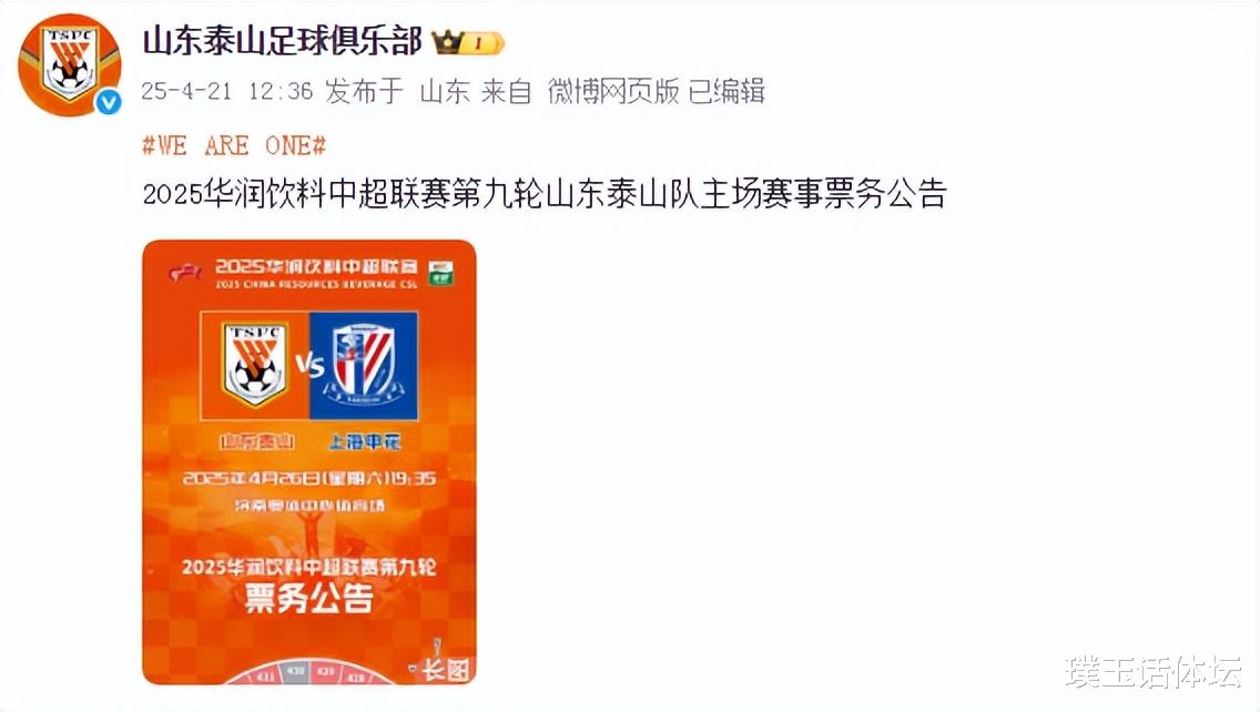 21日上午12点36分,山东泰山队也正式官宣。俱乐部发布了第9轮泰山队主场赛事票务公告,26日泰山队主场战申花,票价是100、150、200、300和600元,售票时间是4月21日15点到26日19点35分。