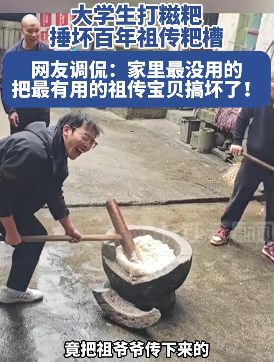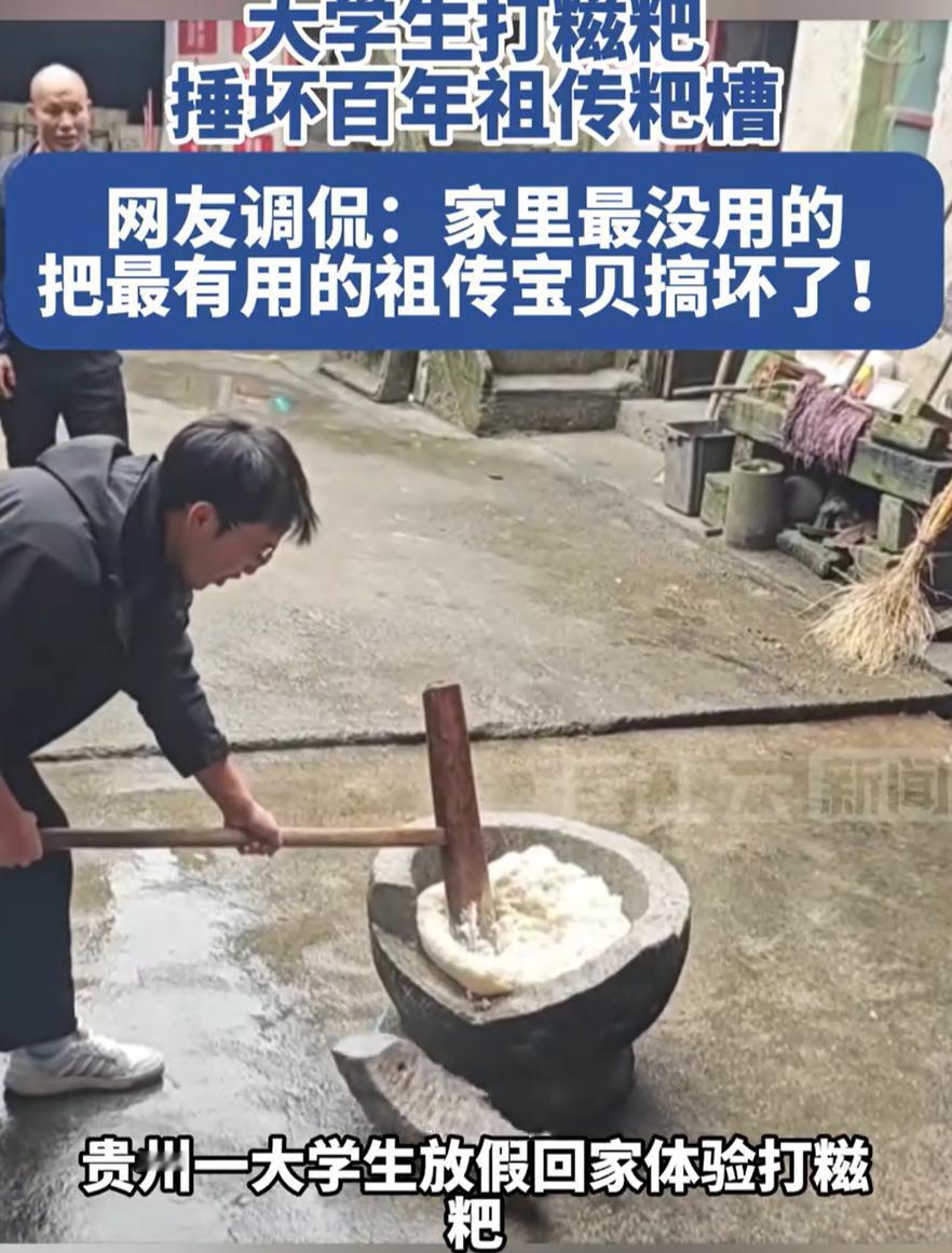 “成事不足败事有余!”贵州,一大学生放假回家,看到家人在锤糍粑,心血来潮也要上手体验一下,结果一锤下去直接把上百年的粑槽给砸碎了。网友:家里最没用的把最有用的宝贝给弄坏了 第一批放假回家的大学生闲来无事,正赶上家里打糍粑。石槽稳稳架着,木锤起落间,糯米渐渐黏糯绵密,空气里都是熟悉的米香。他站在旁边看了一会儿,心里痒,就接过锤子也想试试 家里人说,小心点,这槽子比你爷爷岁数都大。他点点头,抡起锤子,可手里毕竟没准头,一锤下去,没落在糯米团上,却结结实实撞在了石槽边缘 闷响过后,槽子裂了。不是小缝,是彻底碎开了 男孩愣在原地。他说自己从来没打过糍粑,不知道轻重。而那个被砸碎的粑槽,是他祖爷爷传下来的,实实在在用了上百年。原本边沿就有些旧伤,这下彻底结束了使命 一件老物件,就这样在一个最平常的下午,被家里最年轻的、原本想帮忙的手,给敲碎了。听起来像是个让人哭笑不得的意外,但仔细想想,里头有种很深的无奈 那不仅仅是个石槽。它是家里过年过节必定出场的老伙计,装着好几代人的记忆。谁小时候没趴在边上,等着吃第一口热糍粑呢?它的纹路里渗着经年的糯米油光,边角的磨损记录着每一次捶打的力度。它更像一个沉默的见证者,看着这个家族添丁进口,日子起起落落 可传到今天,它碎得有点潦草。不是用坏的,是手艺生疏了,是那种代代相传的生活经验,出现了断裂 这倒不是谁的错,只是一种说不出的遗憾,很多老物件的消逝是不可避免的。它们的价值,并不是那种物质上的贵重,而是背后所承载的记忆、情感和历史。这种“传承”,也许对于年轻人来说,已经有些渐行渐远