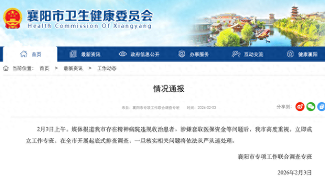 2月3日上午,媒体报道襄阳市存在精神病院违规收治患者、涉嫌套取医保资金等问题后,襄阳市高度重视,立即成立工作专班,在全市开展起底式排查调查,一旦核实相关问题将依法从严从速处理。