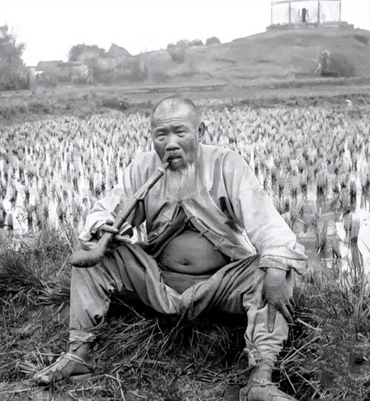 这是一张拍摄于约1900年的老照片,记录的是一位在广州郊外稻田边歇息的老农,老人袒露着肚子,手持一杆竹子自制的旱烟枪,神态悠然。他肥硕的身材在普遍贫困的晚清农民中较为少见,说明其家境相对殷实,但本质仍是靠劳作维生的农户。