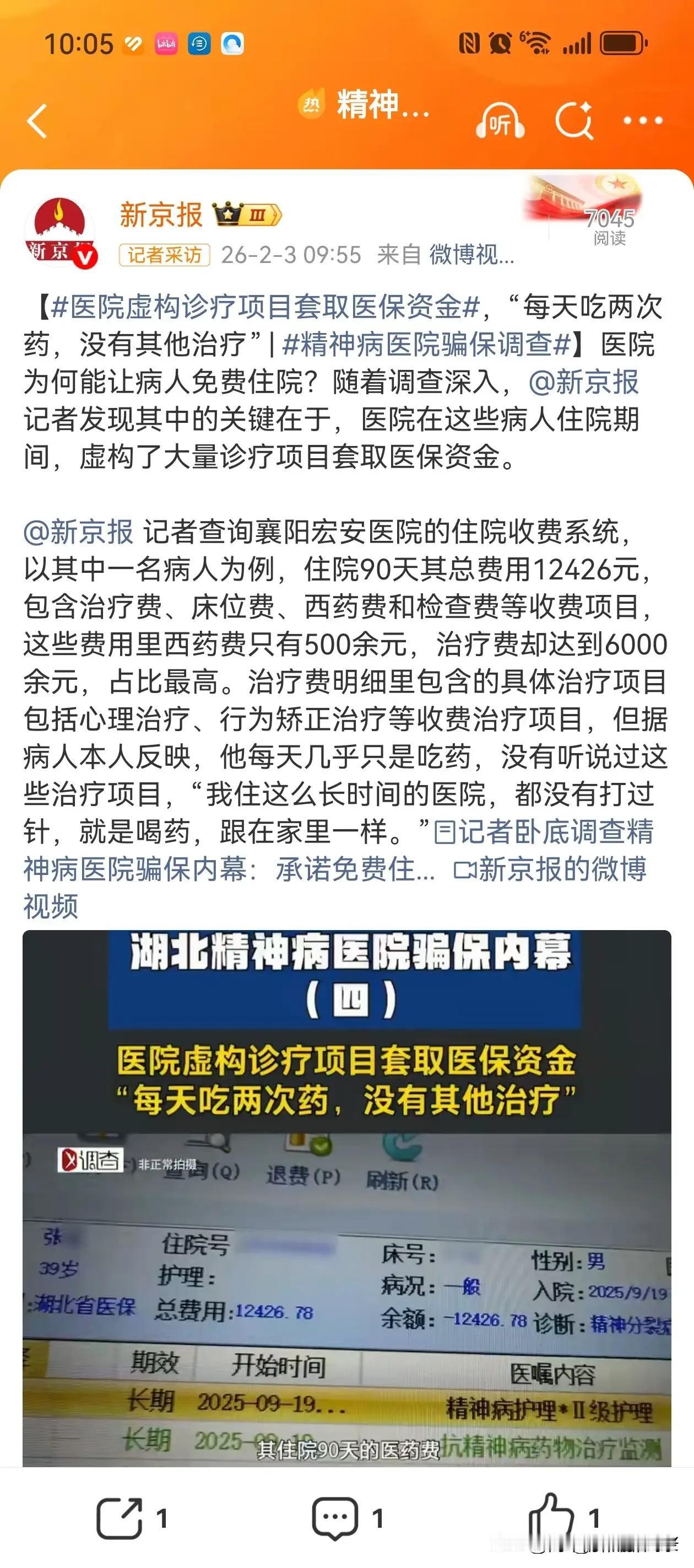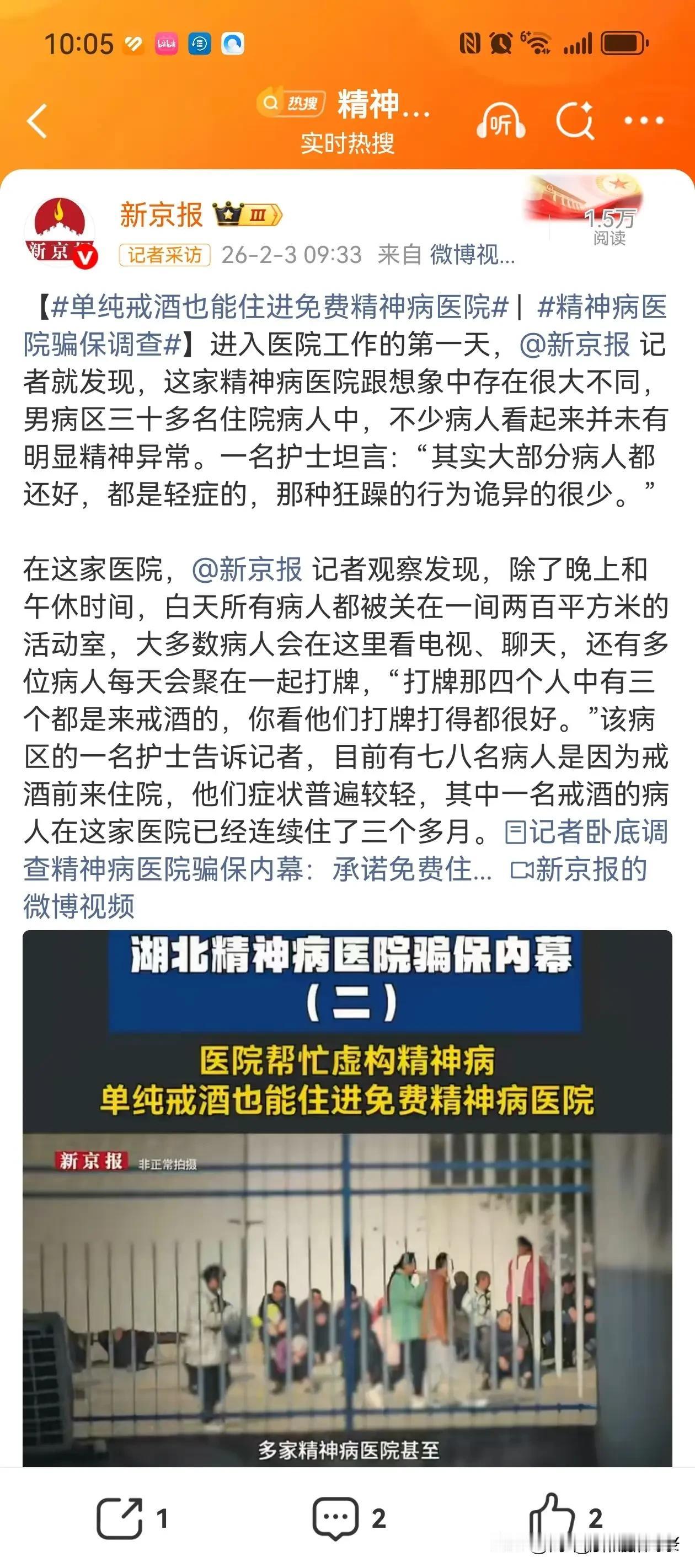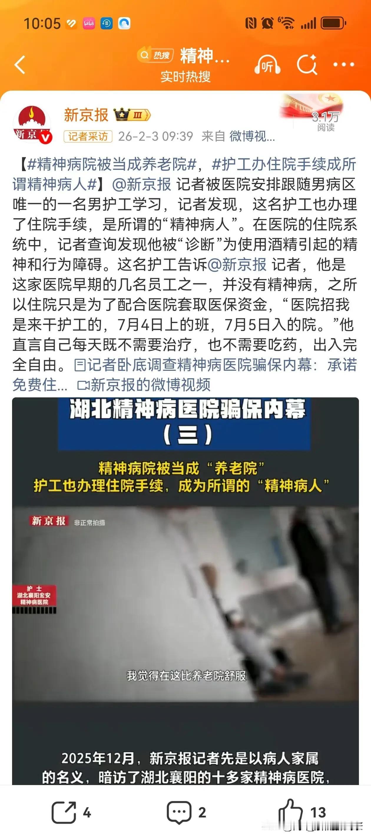 新京报记者卧底湖北襄阳的精神病院,揭开的真相让人脊背发凉。 这里住院不用花钱,听着像好事。可进去了,就别想轻易出来。一个住院的人,能给医院套出5000块医保金。 整个襄阳市,这样的精神病院有20多家,居然没人觉得不对劲。里面住着的,大多不是真的精神病人。不听话?等着挨揍。敢顶嘴?直接绑起来。 很难相信,这是2026年还在发生的事。有人纳闷,没病为啥要进精神病院?来的多是穷人。医院说管吃管住,对走投无路的人来说,这诱惑像根救命稻草。 他们大概没想到,这扇门进去容易,想推开比登天还难。这些人里,有的是孤寡老人,有的是暂时没找到活计的农民工,有的是被家人暂时“托付”的。 他们冲着“免费吃住”来,却一头扎进了牢笼。在这里,尊严是奢侈品。稍有不从,拳头、束缚带就成了“规矩”。没人听他们辩解“我没病”,因为医院要的不是病人,是能套取医保金的“工具”。 20多家医院,像一张密不透风的网。医保金成了唐僧肉,谁都想咬一口。可这钱,本是给真正需要的病人救命的。被这样套取,真正的精神病人该怎么办? 更让人揪心的是监管的缺席,这么多医院集体钻空子,难道就没人察觉?还是察觉了,却睁一只眼闭一只眼?医保的漏洞,成了某些人敛财的通道,而代价是无辜者的自由和尊严。 这些被关着的人,喊天天不应,叫地地不灵。他们的家人可能还在盼着“医院能照顾好他”,却不知亲人正在里面受着委屈。等意识到不对劲,想接人出来,医院总有各种理由搪塞。 “病情没稳定”“还需要观察”,说到底,就是没榨干最后一分价值。2026年的今天,我们总以为文明在进步,制度在完善。可襄阳这些精神病院的操作,像一记耳光,打在所有人脸上。 它暴露的不只是个别医院的贪婪,更是监管链条上的巨大窟窿。医保是民生底线,怎么就成了滋生黑幕的温床? 对那些被关在里面的穷人来说,他们想要的不过是一口饭、一个遮风的地方,却成了别人谋利的棋子。这世上最狠的陷阱,往往裹着“好意”的外衣。 希望这曝光能撕开一道口子。让那些被无辜关押的人早点回家,让钻空子的医院受到严惩,让医保金真正用在该用的地方。别让“管吃管住”,变成吞噬普通人的深渊。 毕竟,再卑微的生命,也该有选择的权利,有不被随意剥夺自由的尊严。这底线,容不得践踏。 消息来源:新京报