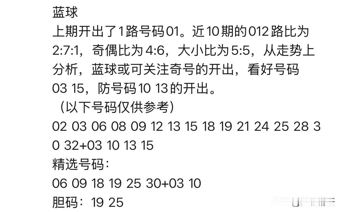 双色球第26015期今晚开奖,丹丹再度亮相,本期精选号码为:06、09、18、19、25、30,蓝球03、10。 本期看点: • 重号:红球19号有望再次开出。 • 斜连码:红球06、18、25值得关注。 • 连码:红球18+19组合值得期待。 • 形态:红球三区比2:2:2,奇偶比3:3。 • 胆码:红球19、25作为重点胆码。 • 蓝球:看好03、10、13、16,其中03、10更具优势。 对于丹丹的观点,你是看好这几个号码,还是当做杀号呢?希望她在新规中能再创辉煌,再次命中一等奖。