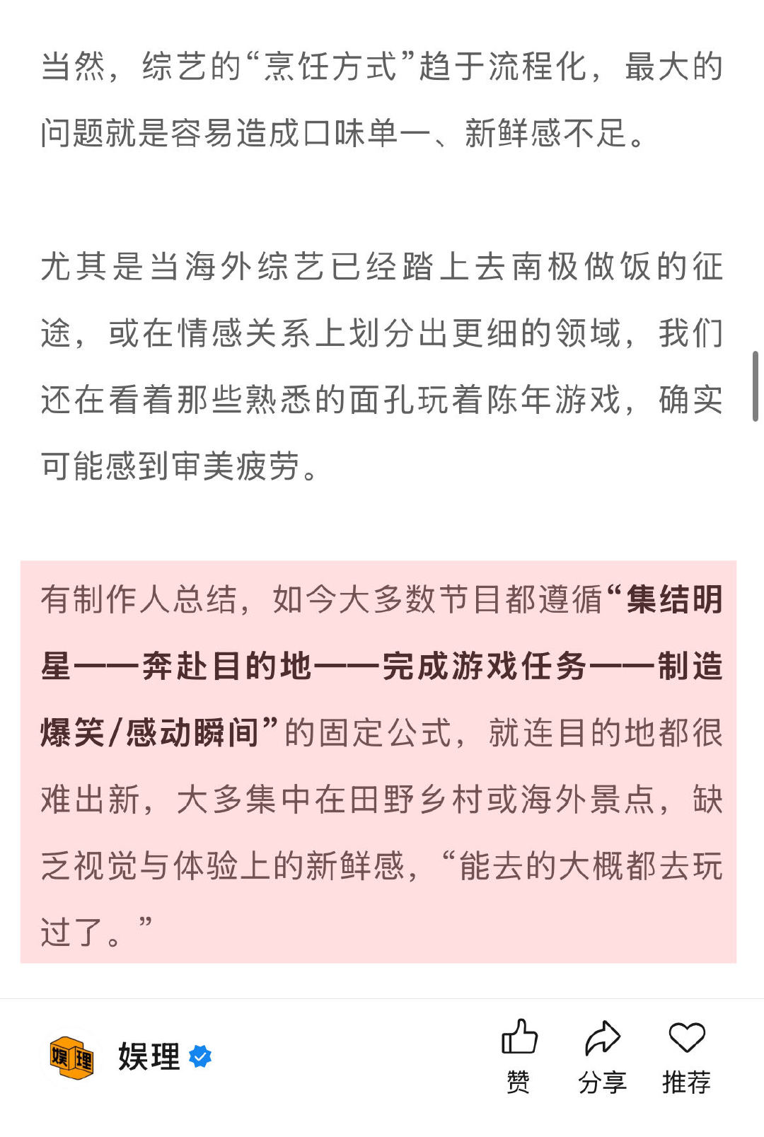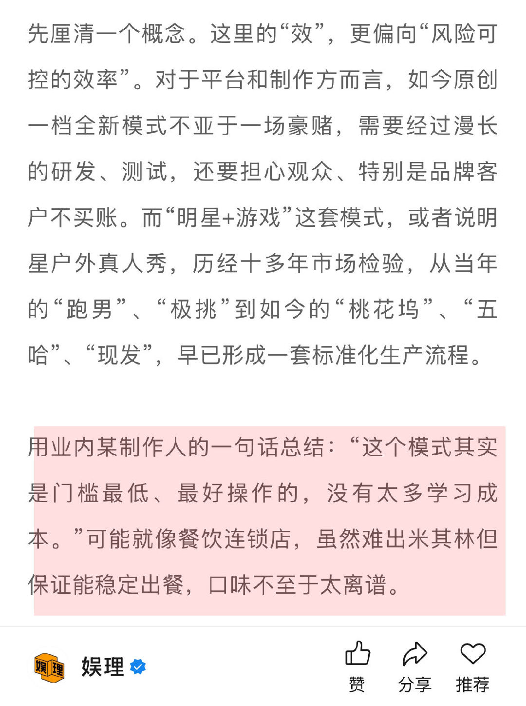 四大平台140档综艺靠谱吗 预算收紧明星真人秀为何仍被选择 原创一档全新模式需要经过漫长的研发、测试,还要担心观众、特别是品牌客户不买账。而“明星+游戏”这套模式,从当年的“跑男”、“极挑”到如今的“桃花坞”、“五哈”、“现发”,早已形成一套标准化生产流程。“这个模式是门槛最低、最好操作的,没有太多学习成本。” 娱理独家↓
