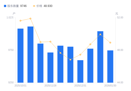日期A股户数(户)流通A股户均持股数(股)户均持股市值(万元)2026-01-3097465015.1924.542026-01-20100414867.8424.312026-01-0997735001.3324.372025-12-3195962084.209.892025-12-1998032040.199.552025-12-1098192036.879.712025-11-2897142058.8810.102025-11-2098512030.259.952025-11-10101141977.4610.262025-10-31100821983.7310.24