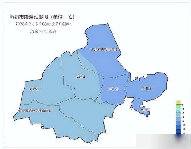降温、大风:酒泉市大部气温将下降6℃~9℃,7日清晨最低气温将降至-16℃~-12℃,其中,肃州区、金塔县、玉门市和肃北县北部(马鬃山镇)气温累计降幅可达8℃以上。5日酒泉市大部有5级~6级偏西风,阵风可达7级~8级,局地伴有沙尘。