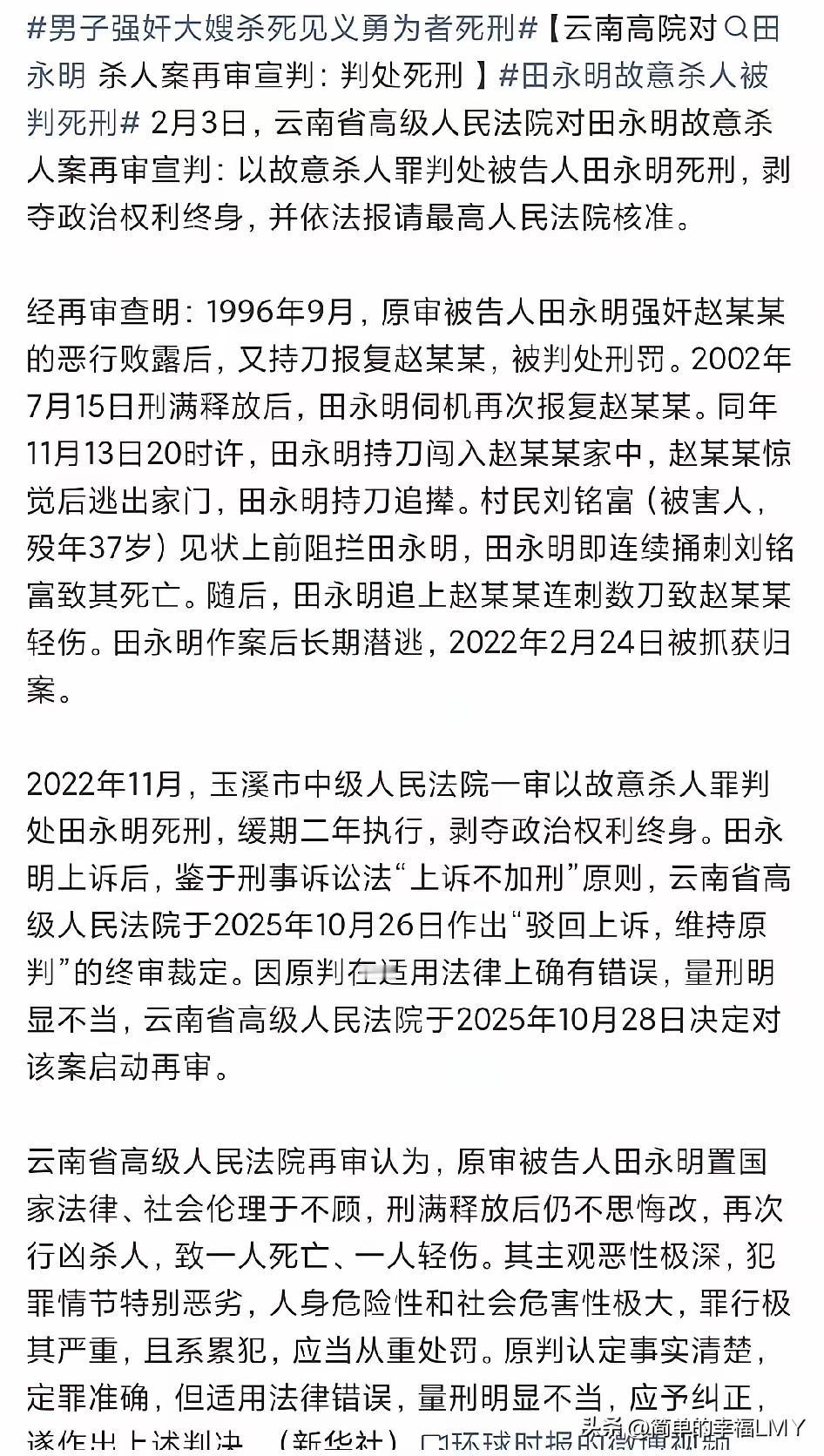 正义或许会迟到,但终究不会缺席。云南高院的改判,让田永亮伏法,大快人心。这个曾犯下强奸、杀人未遂,出狱后又报复杀害见义勇为者的恶魔,终于迎来了应得的结局。   故事要从1996年9月说起。20岁的田永亮,趁着哥哥不在家,对年轻貌美的大嫂赵某某起了邪念。他持刀威胁,残忍地实施了强奸。 事后怕事情败露,竟狠心对大嫂下了杀手,所幸赵某某命大,逃过一劫。案发后,田永亮因强奸罪、故意杀人罪、窝赃罪,被判处有期徒刑9年。 只是那时谁也没想到,这9年的牢狱之灾,没能让他洗心革面,反而埋下了更深的仇恨。2002年11月,田永亮因减刑提前出狱。 出狱后的他,非但没有反思自己的罪行,反而将所有怨恨都记在了大嫂赵某某身上。他揣着刀,气势汹汹地闯进赵某某家,一心要报复。 赵某某察觉到危险,急忙从后门逃出。田永亮紧追不舍,像一头失控的野兽。就在这危急关头,37岁的村民刘铭富出现了。 他看到田永亮持刀追赶妇女,想都没想就冲了上去,试图拦住这个疯狂的歹徒。这一拦,是挺身而出的勇气,是路见不平的正义。 可杀红了眼的田永亮,早已没了人性。他对着刘铭富连捅数刀,鲜血瞬间染红了地面。刘铭富倒下了,为了保护陌生人,永远地闭上了眼睛。   田永亮没有停手,继续追赶赵某某。追上后,又对她连捅数刀。赵某某再次遭遇生死考验,好在有其他人及时赶到阻止,她才从鬼门关又爬了回来,最终只是轻伤。 命运对赵某某何其残酷,两次被同一个人置于死地;可又何其眷顾,让她两次死里逃生。 田永亮犯下如此滔天大罪,却选择了逃亡。这一逃,就是20年。 这20年里,他隐姓埋名,或许过着提心吊胆的日子;可刘铭富的家人,却要在失去亲人的痛苦中度过每一天,赵某某也要时刻活在被报复的恐惧里。 直到2022年2月24日,田永亮被抓获,这起尘封20年的案件才终于有了进展。谁都明白,若不是被抓,他绝不会放过赵某某。 2022年11月,玉溪中院审理此案,以故意杀人罪判处田永亮死刑,缓期两年执行。这个判决一出,立刻引爆了舆论。 网友们炸开了锅,纷纷质疑:如此丧心病狂的罪犯,强奸、杀人未遂在前,出狱后又杀害见义勇为者,重伤受害者,这样的人,凭什么只判死缓?判得太轻了! 田永亮却不满足,他不服判决,上诉到了云南省高院。2025年10月26日,云南省高院按照“上诉不加刑”的原则,维持了原判,驳回了上诉。 这一下,舆情更是像滚雪球一样越滚越大,公众的愤怒几乎要冲破屏幕。大家都在问:法律的公正何在?见义勇为者的牺牲,难道就换不来一个公道吗? 舆论的压力像一座山,压在了法院身上。就在维持原判两天后,2025年10月28日,云南省高院突然宣布,认为该案原判在适用法律上确有错误,量刑明显不当,决定启动再审。 这个决定,让无数为刘铭富鸣不平的人看到了希望。2026年1月21日,田永亮杀人案再次开庭。法庭上,证据一一呈现,田永亮的罪行被再次审视。 2月3日,最终判决下来了:田永亮因故意杀人罪被判处死刑,剥夺政治权利终身,并上报最高人民法院审核。消息传来,无数人拍手称快。这场跨越了30年的正义追寻,终于画上了句号,汹涌的舆情也得以平息。 回望这起案件,改判的过程何其艰难。要知道,当地检察院最初提供的证据,都是支持死缓的。可最终,法院顶住了压力,纠正了错误,这背后是对正义的坚守,是对民意的倾听,更是对法律尊严的维护。   有人说,田永亮第一次犯罪就该判死刑。1996年那起案件,强奸、故意杀人未遂,数罪并罚才判9年,确实太轻了。正是这“轻判”,让他觉得法律可以被挑衅,才敢在出狱后再次犯下滔天罪行。 如果当初能依法严惩,或许就不会有后来的悲剧,刘铭富就不会死,赵某某也不用再受一次惊吓。刘铭富的牺牲,让人痛心。他只是一个普通的村民,却在关键时刻挺身而出,用生命诠释了什么是“见义勇为”。 他的死,不该被遗忘,更不该换不来一个公正的判决。云南高院的改判,不仅是给了刘铭富家人一个交代,给了赵某某一个安慰,更是给了所有心怀正义的人一个信念:好人不会白死,恶行终将受惩。   田永亮的下场,是所有穷凶极恶之徒的最终归宿。刘铭富的英名,会被永远铭记在民众心中。司法纠错的行动,会成为法治进程中浓墨重彩的一笔。这起案件告诉我们,人活于世,须守人伦底线,遵法律规章,存敬畏之心,怀良善之念。 法律是维护社会公平正义的最后一道防线,若这道防线松动了,受伤的就是无辜的百姓。只有让违法者付出应有的代价,才能震慑潜在的犯罪,才能让见义勇为者没有后顾之忧,才能让社会充满正气。   田永亮的伏法,是正义的胜利。虽然这条路走得曲折,但终究抵达了终点。愿刘铭富安息,愿他的家人能得到慰藉,愿赵某某能彻底走出阴影,也愿这样的悲剧永远不再发生