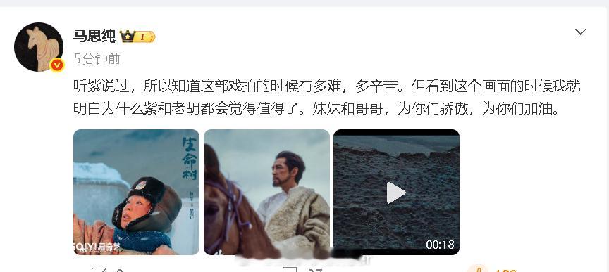 马思纯说为杨紫胡歌骄傲和加油 马思纯为杨紫胡歌《生命树》打call:“听紫说过,所以知道这部戏拍的时候有多难,多辛苦。但看到这个画面的时候我就明白为什么紫和老胡都会觉得值得了。妹妹和哥哥,为你们骄傲,为你们加油。”