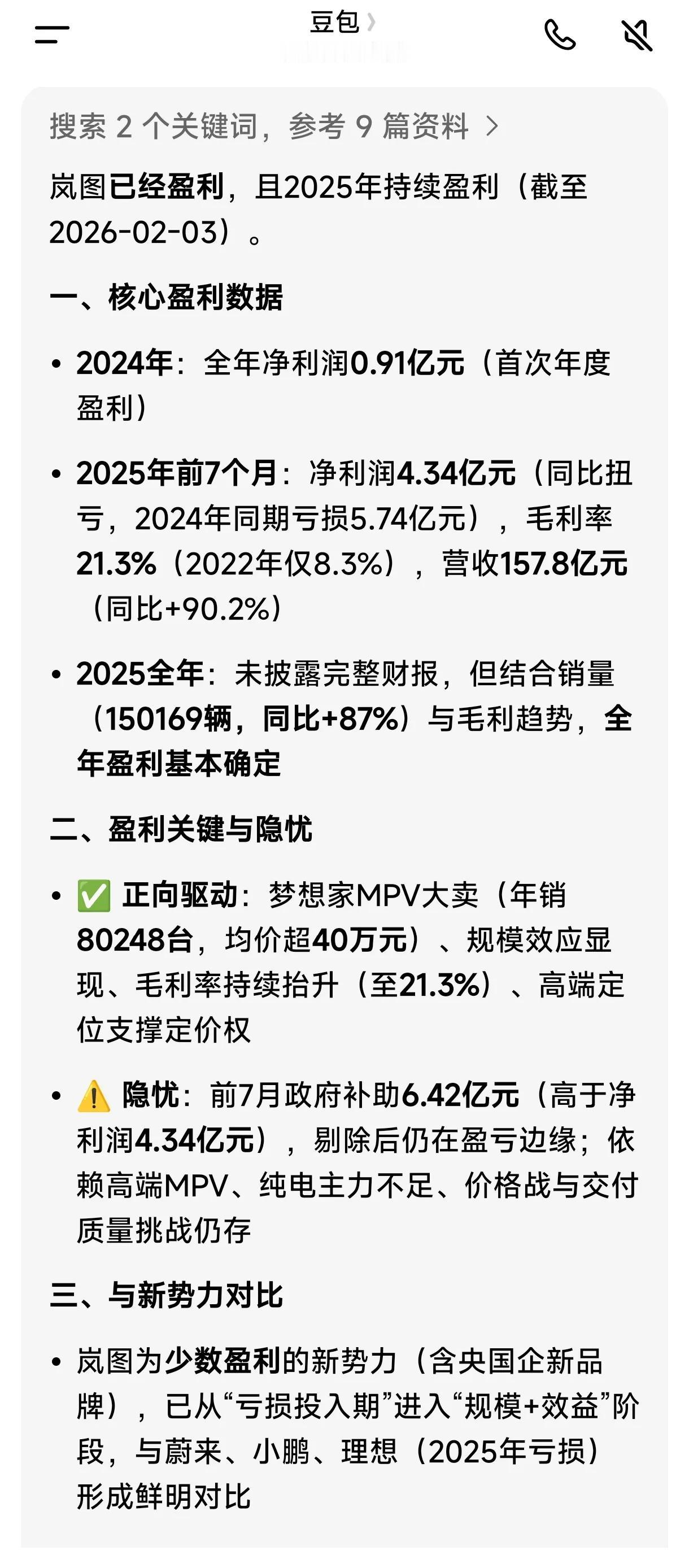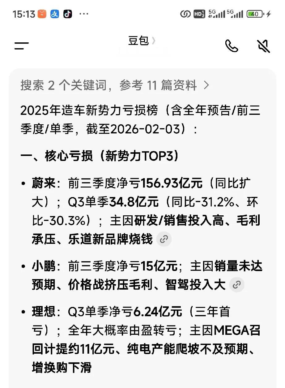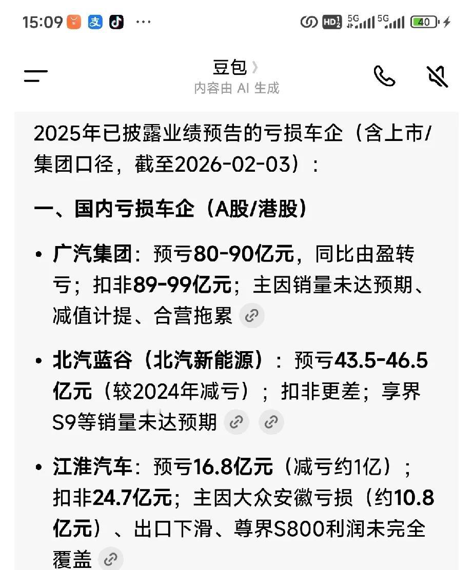 2025年广汽集团转型阵痛罕见预亏80亿到90亿 ,那么还有哪些车企处于亏损状态? 根据AI搜索得知—— 北汽蓝谷(北汽新能源):预亏43.5-46.5亿元(较2024年减亏);扣非更差;享界S9等销量未达预期 。 江淮汽车:预亏16.8亿元(减亏约1亿);扣非24.7亿元;主因大众安徽亏损(约10.8亿元)、出口下滑、尊界S800利润未完全覆盖。 蔚来、小鹏2025年前三季度是亏损的。理想2025年第三季度出现了亏损,全年不知道有没有盈利。 目前岚图、零跑、赛力斯问界处于盈利状态。(图五六豆包AI查询)