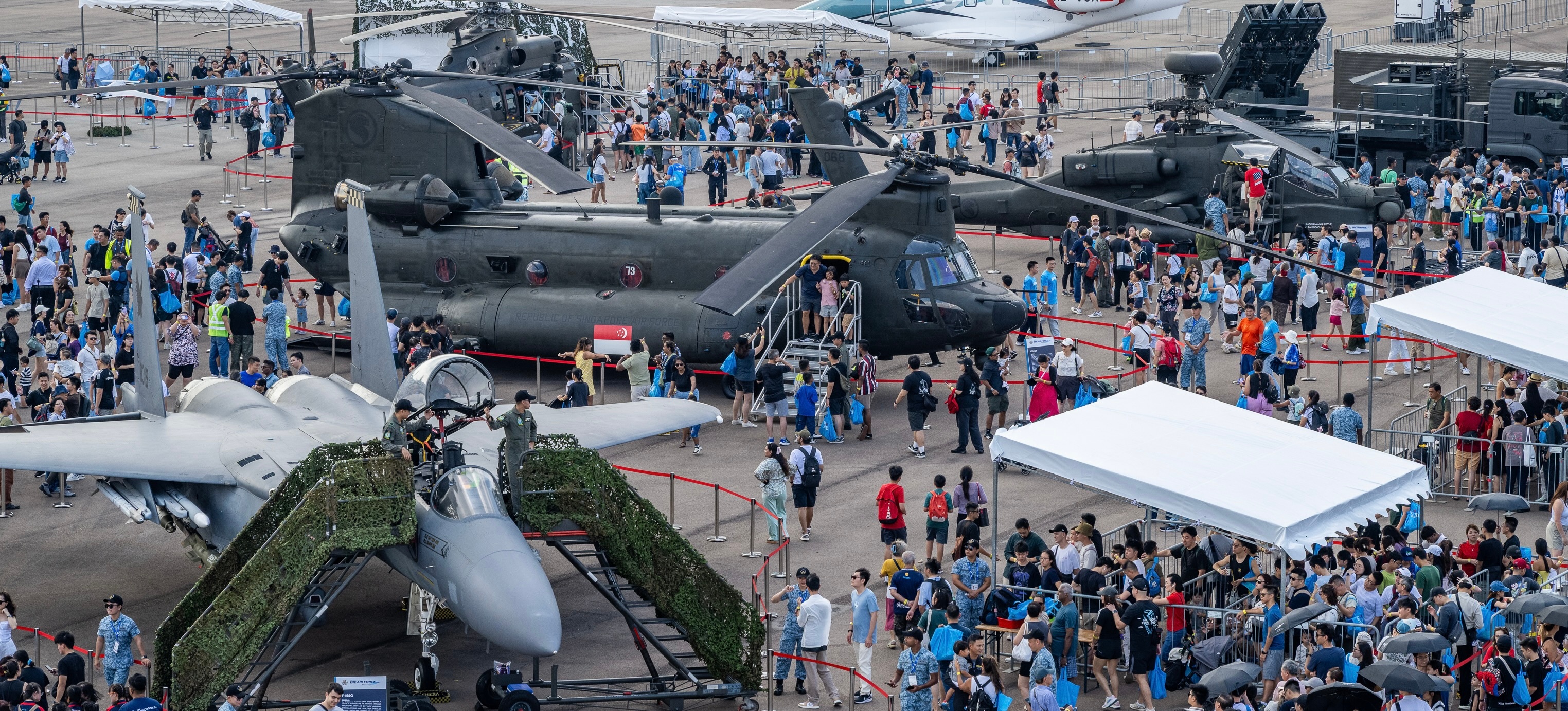 2026年新加坡航展 新加坡航展上的F-16 C战斗机和一架AH-64 D阿帕奇攻击直升机