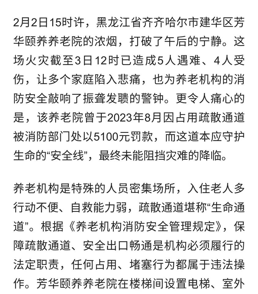 齐齐哈尔一养老院发生火灾。5人身亡,4人受伤。 该养老院2023年在消防检查中,