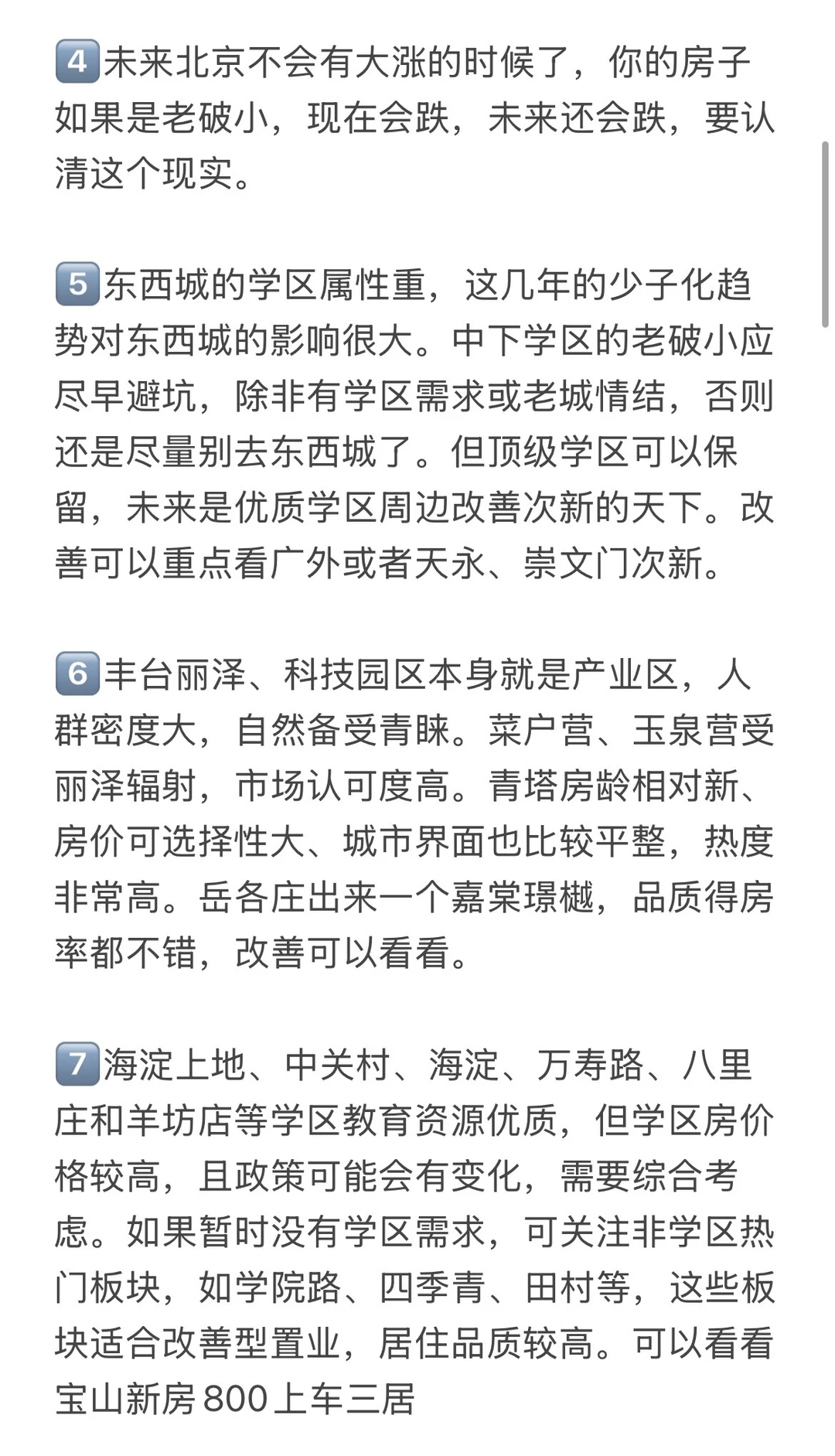 5️⃣东西城的学区属性重,这几年的少子化趋势对东西城的影响很大。中下学区的老破小应尽早避坑,除非有学区需求或老城情结,否则还是尽量别去东西城了。但顶级学区可以保留,未来是优质学区周边改善次新的天下。改善可以重点看广外或者天永、崇文门次新。