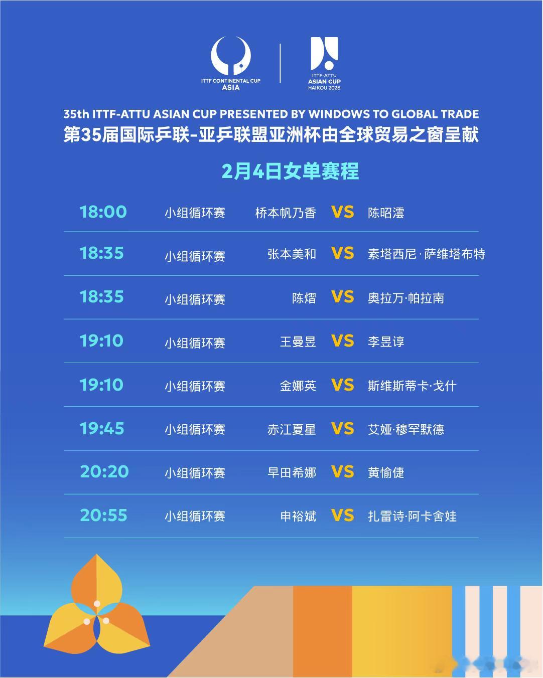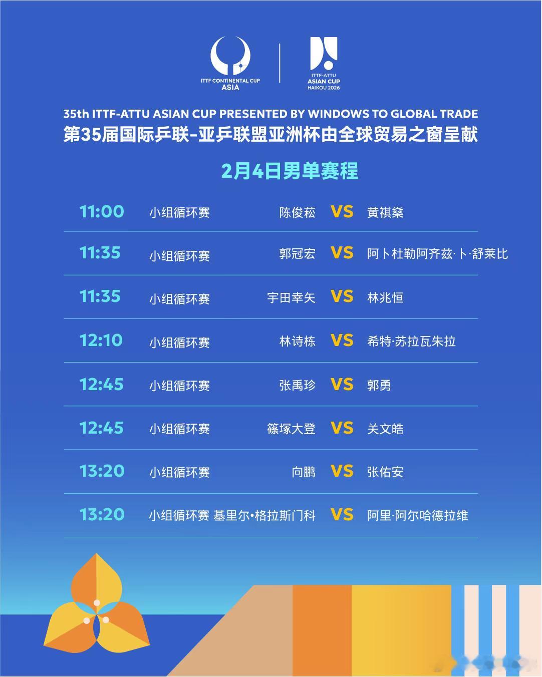 海口亚洲杯2月4日赛程:11:00 T1 孙颖莎VS叶伊恬11:00 T12杜凯琹VS卡马洛娃11:00 T3 陈俊菘VS黄祺燊11:35 T2 林兆恒VS 宇田幸矢12:10 T1 林诗栋VS苏拉瓦朱拉12:10 T2 蒯曼VS苏籽童12:45 T2 关文皓VS 篠塚大登12:45 T3 陈幸同VS简彤娟13:20 T1 王艺迪VS舒麟茜13:20 T2 向鹏VS张佑安18:00 T1 黄镇廷VS 肯日古洛夫18:35 T2 何钧杰VS田中佑汰18:35 T3 陈熠VS奥拉万·帕拉南19:10 T1 王曼昱VS李昱谆19:10 T2 周启豪VS冯耀恩19:45 T1 王楚钦VS阿卡什·帕尔20:20 T1 陈垣宇VS库尔曼加利耶夫